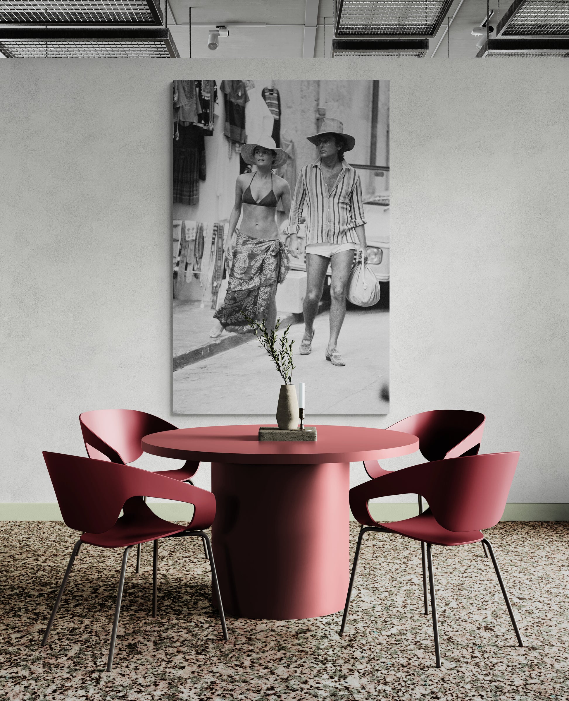 In this everyday scene captured by Daniel Angeli in 1972, Ali MacGraw and Robert Evans embody the essence of casual glamor as they stroll through the picturesque village of Saint-Tropez. Ali MacGraw, dressed in a sleek bikini and paisley sarong, wearing a rustic straw hat, perfectly exemplifies the natural beauty and bohemian style that defined this decade. Beside him, producer Robert Evans, in his open striped shirt and casual shorts, portrays the archetype of laid-back masculine charm. This image is a living testimony to the fashion and culture of the time.