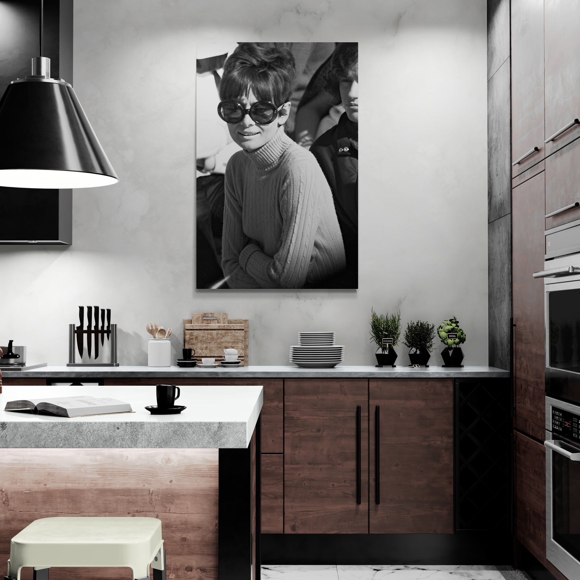 This black and white photograph taken by Daniel Angeli shows cinema icon Audrey Hepburn in 1975 on a sunny terrace in St. Moritz. Her oversized sunglasses and cabled turtleneck sweater emphasize casual elegance. This image depicts not only the fashion of the time, but also the timeless grace of the actress.