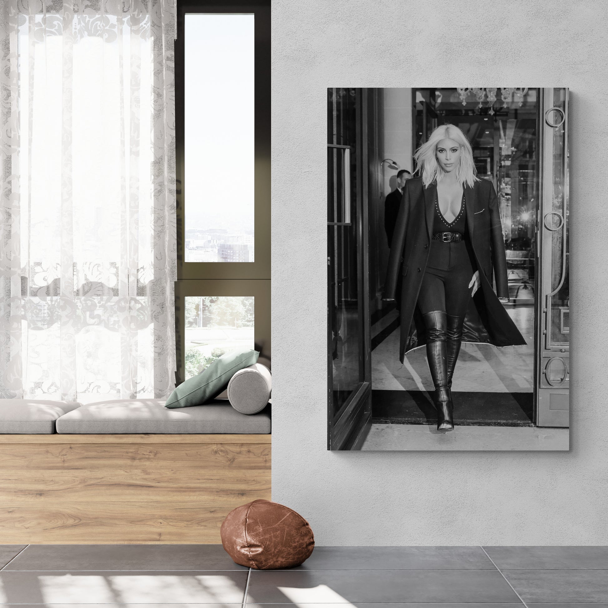 Kim Kardashian exits the Royal Monceau in Paris in 2015. This image, in its style and composition, would make a decorative addition to a modern space, bringing a touch of urban elegance and glamor to the interior.
