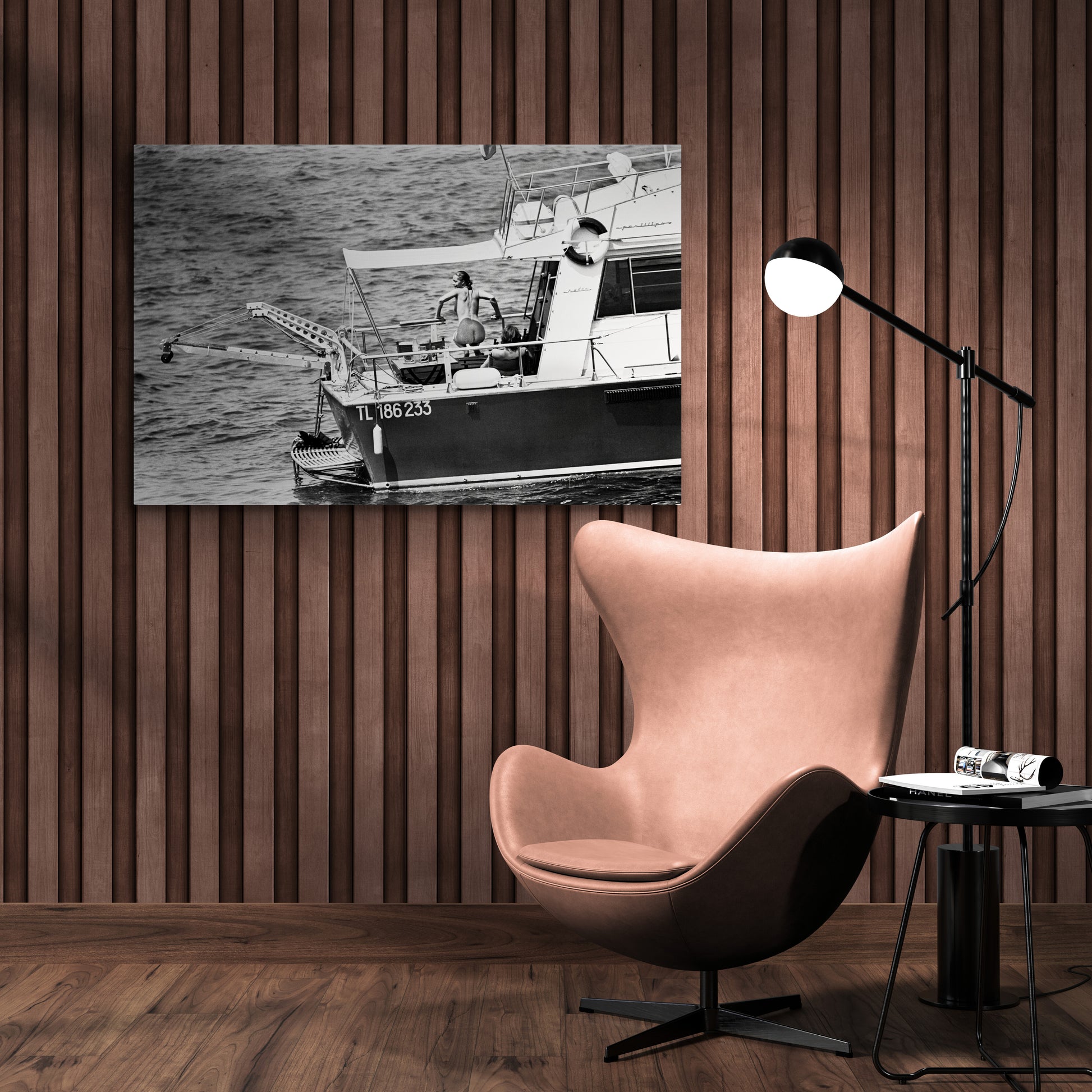 Captured by the telephoto lens of Daniel Angeli, this image of Romy Schneider evokes a feeling of freedom and elegance on the blue waters off Saint-Tropez in 1976. On the rail of her yacht, she embodies feminine beauty in her form the most natural and without artifice, her gaze lost in the immensity of the sea. Choosing this photo is inviting the timeless charm of Romy Schneider onto your walls.