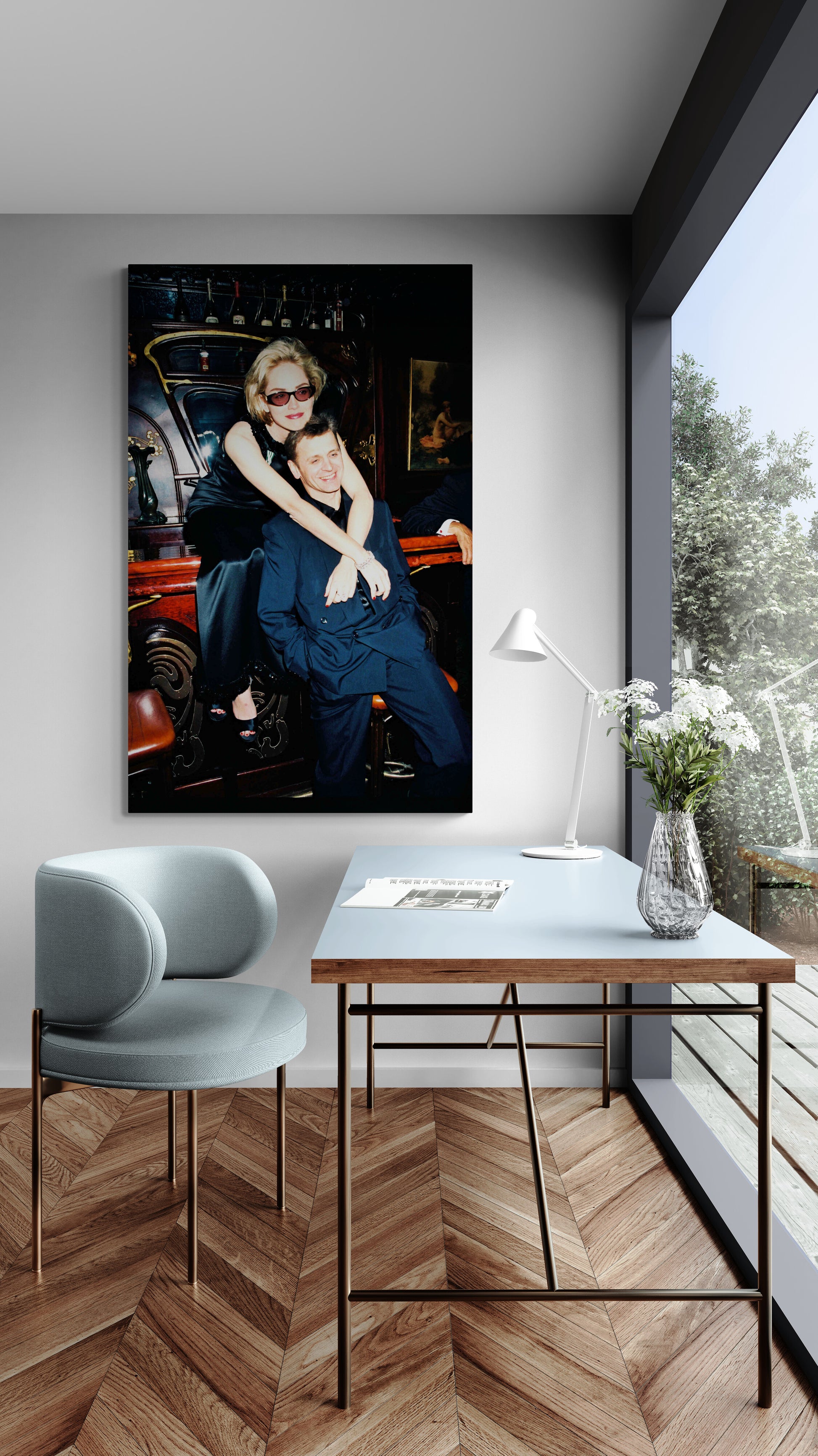 Moment of joy and complicity between Sharon Stone and star dancer Mikhail Baryshnikov immortalized at Maxim's in Paris in 1995, during the celebration of the honor given to Sharon Stone as Knight of Arts and Letters. A glamorous and stylish touch for any interior.