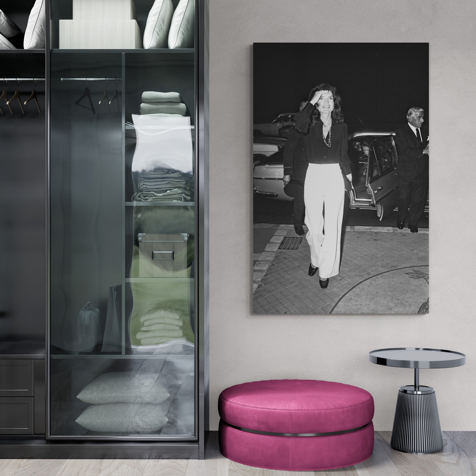 Jackie Kennedy dans la rue à Paris en 1972. En arrière-plan, on distingue Aristote Onassis.