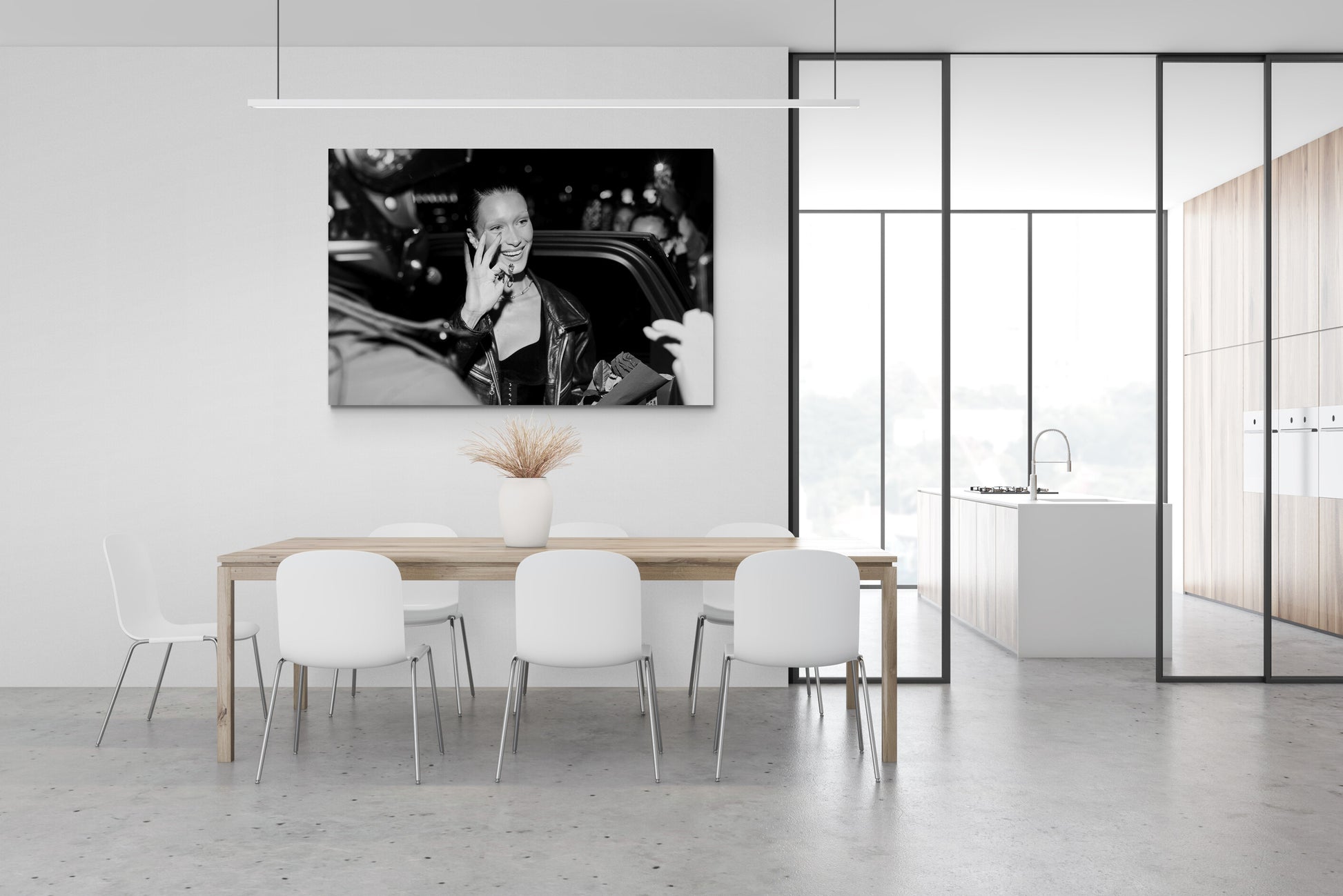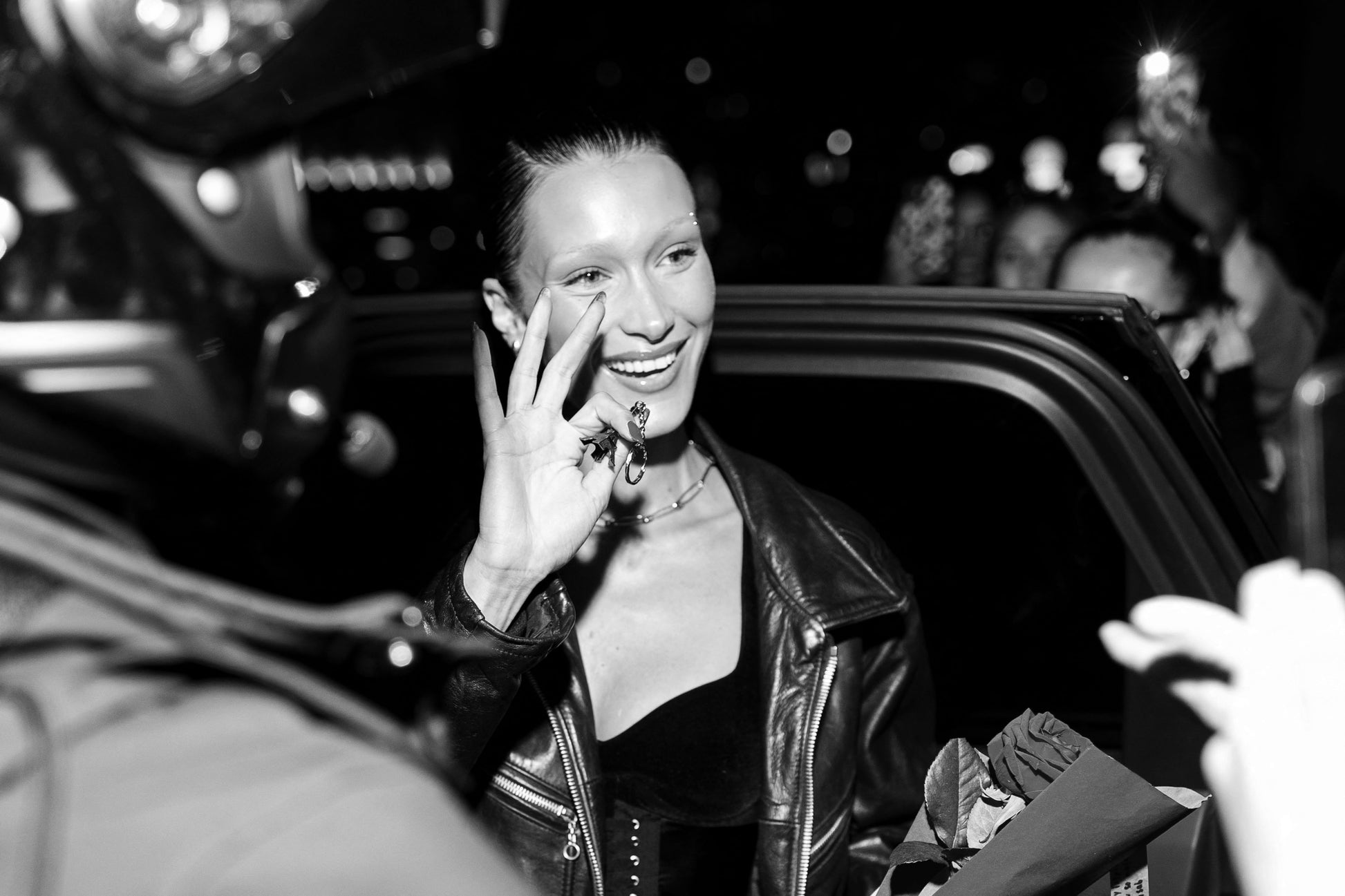 Bella Hadid à Paris en 2022, incarnant l'icône de la mode moderne, affiche une complicité évidente avec l'objectif. L'esthétique brute et le naturel séduisant de la photo ajoutent une touche de chic contemporain à tout intérieur.