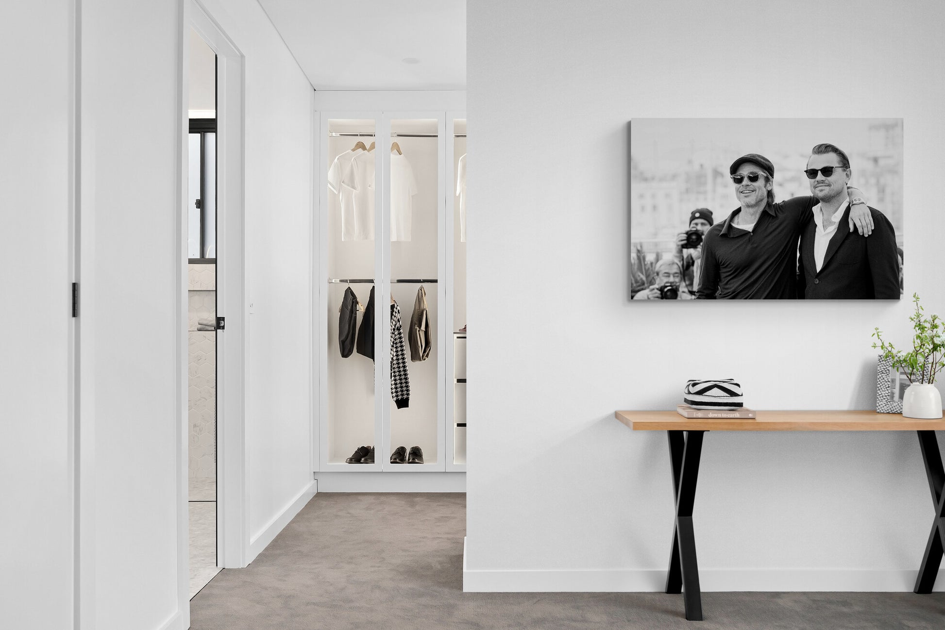Brad Pitt et Leonardo DiCaprio lors du photocall de leur film "Once Upon a Time in Hollywood" au 72ème Festival International du Film de Cannes. Leur charisme incontestable et leur complicité évidente rayonnent. Idéale pour une déco cinéma et glamour.
