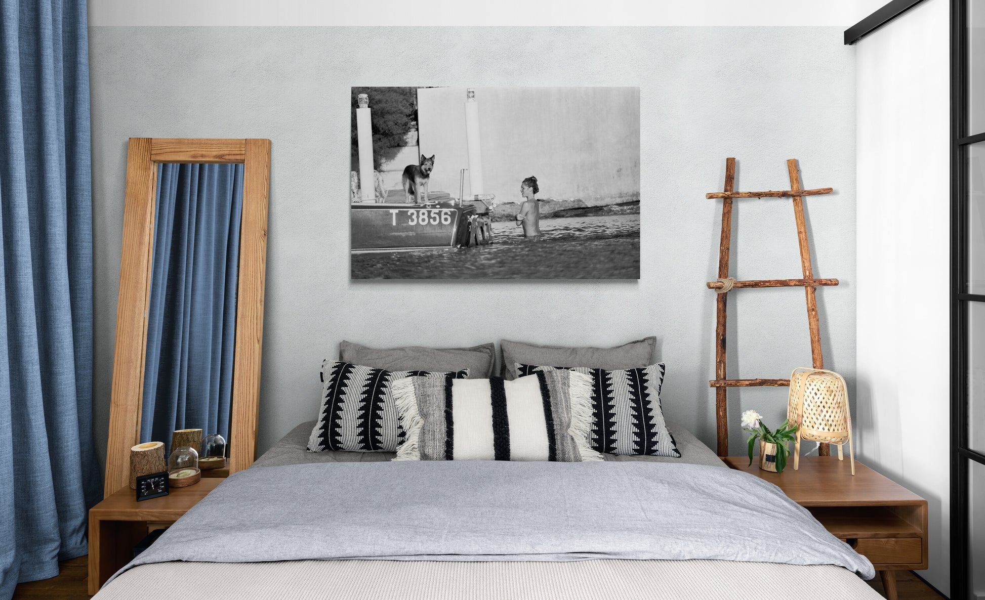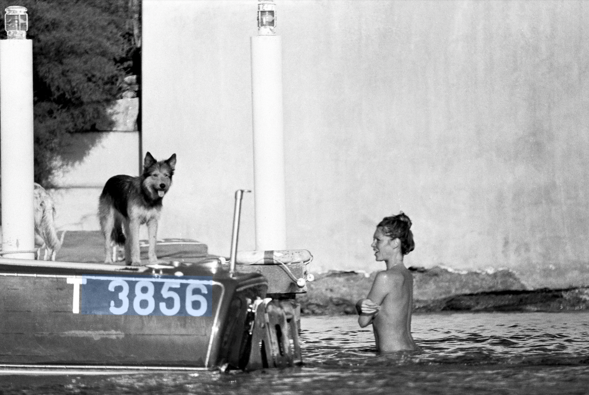 Dans cette photographie en noir et blanc prise par Daniel Angeli, Brigitte Bardot se baigne face à son chien à La Madrague à Saint-Tropez en 1974. Cette image montre non seulement la beauté et la grâce de l'icône, mais aussi la vie tranquille et retirée qu'elle a choisie loin des projecteurs.