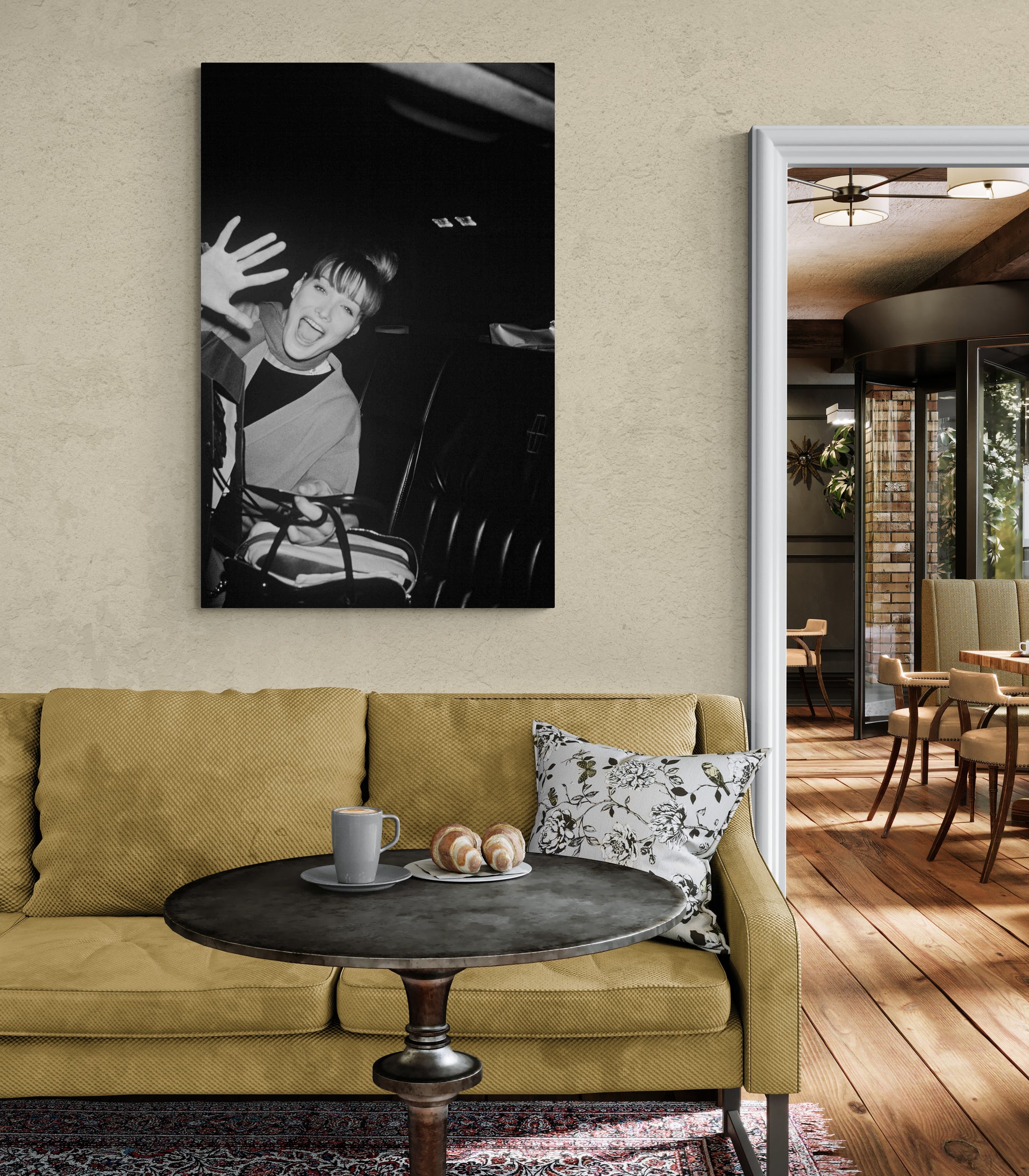 Carla Bruni incarne une joie de vivre contagieuse dans cette photographie en noir et blanc prise à New York en 1994. Cette photo illustre avec humour le jeu du chat et de la souris entre les célébrités et les photographes. Et, accrochée sur un mur, elle donne un côté joyeux et glamour à toute décoration.
