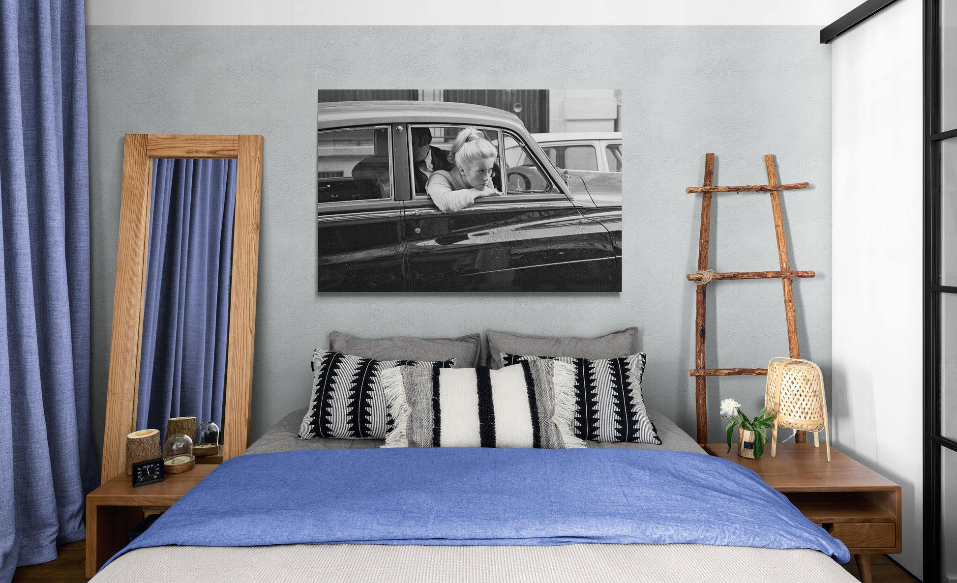 Cette photographie de Catherine Deneuve appuyée à la fenêtre d'une voiture, prise par Daniel Angeli en 1967, reflète l'élégance et le glamour de l'actrice. Cette image évoque non seulement la beauté intemporelle de Catherine Deneuve mais aussi une ère révolue de Paris, avec ses rues pavées et son ambiance de film noir. Un moment capturé, une icône immortalisée.