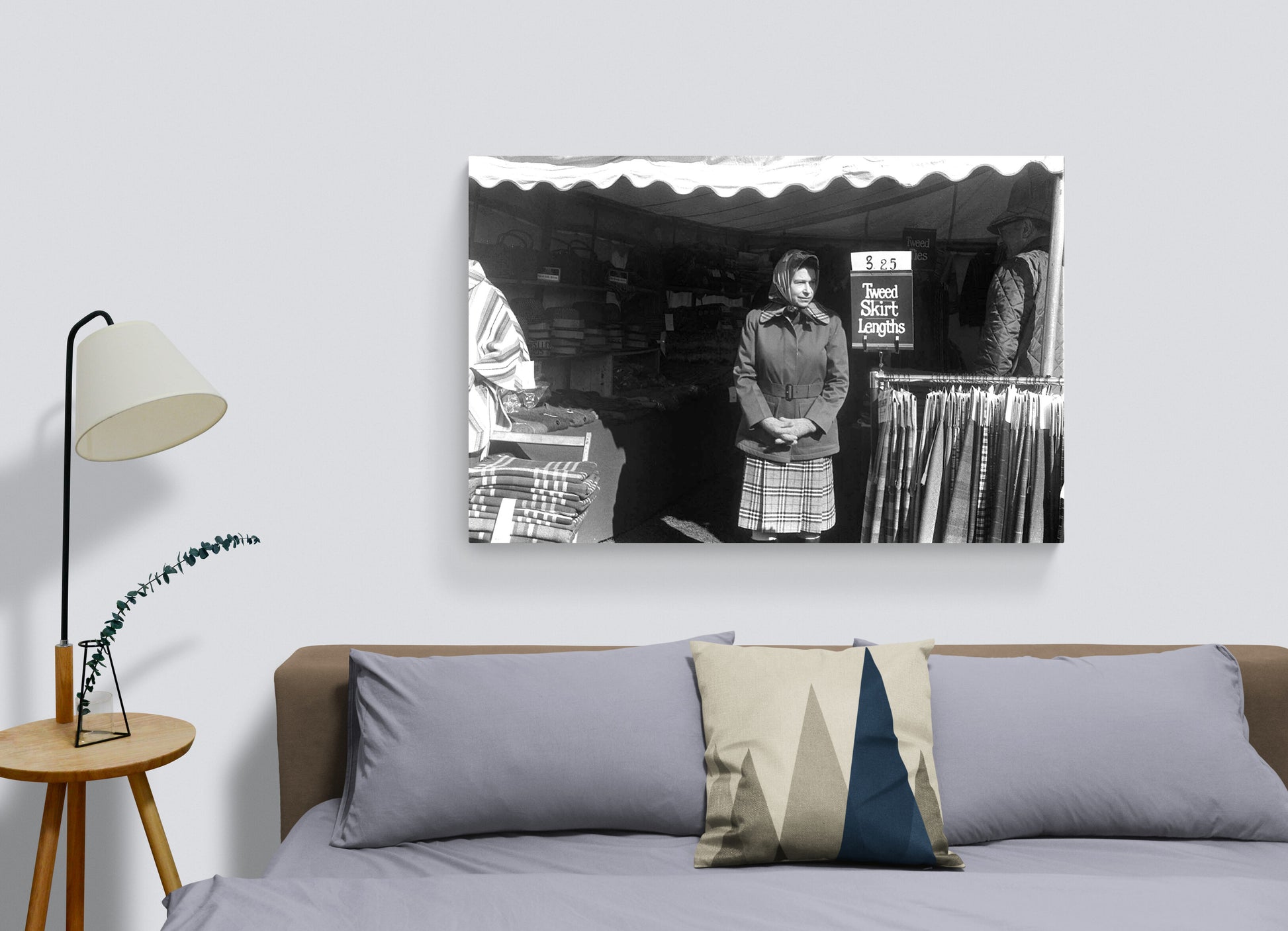 Sa Majesté la Reine Elizabeth II visite le célèbre Badminton Horse Trials en 1978. La reine est postée devant un stand de jupes écossaises, rappelant étrangement la jupe qu'elle porte, un détail qui n'a pas échappé à l'œil observateur et malicieux du photographe Daniel Angeli. Cette photo offre un clin d'œil amusant à la fois à la royauté et à la culture britannique, ajoutant une touche de caractère et d'originalité à tout espace.