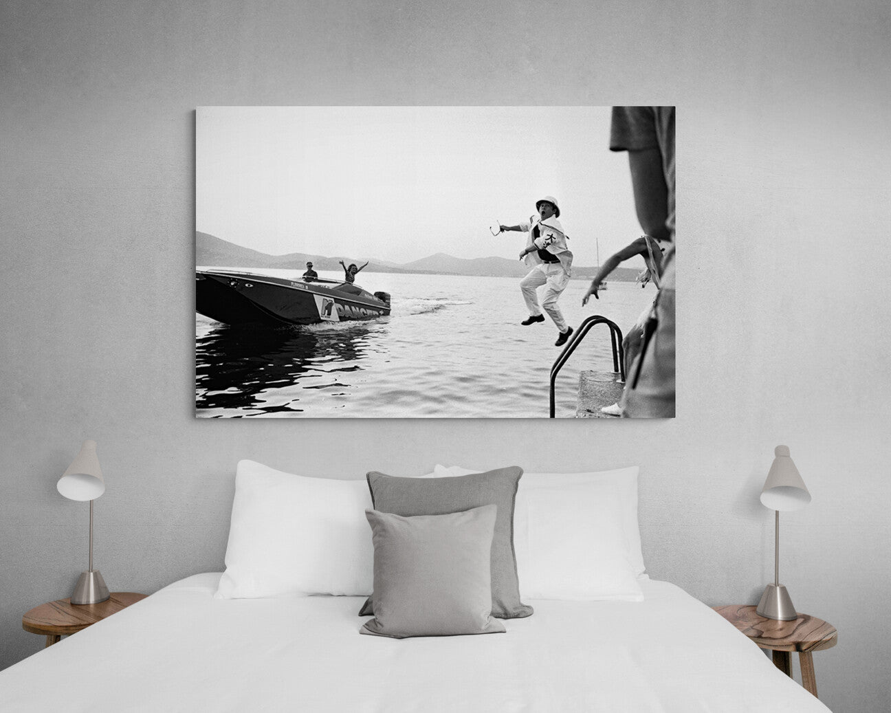 Cette photographie en noir et blanc de Daniel Angeli, prise en 1984, montre Elton John en action lors du tournage du clip "I'm Still Standing" à Saint-Tropez. Capturant un moment de liberté et d'éclat, cette image peut servir de pièce maîtresse dans un décor moderne, ajoutant un élément de mouvement et de luxe avec son ambiance maritime. Parfaite pour dynamiser et apporter un charme vintage à tout espace.