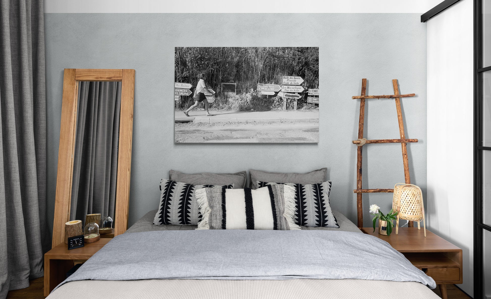 Immortalisée par l'objectif discret de Daniel Angeli, cette photographie en noir et blanc montre Jack Nicholson en pleine balade sur les routes tropéziennes. Ce cliché nous rappelle une époque où les célébrités, loin des crépitements incessants des flashs et de l'effervescence des réseaux sociaux, pouvaient se permettre de déambuler incognito le long de ces routes mythiques. Chaque panneau, comme un décor soigneusement disposé, porte le nom de lieux symboliques, dessinant un itinéraire de détente et de loisir, d’une résidence de charme à une plage de rêve. Insolite et vintage.