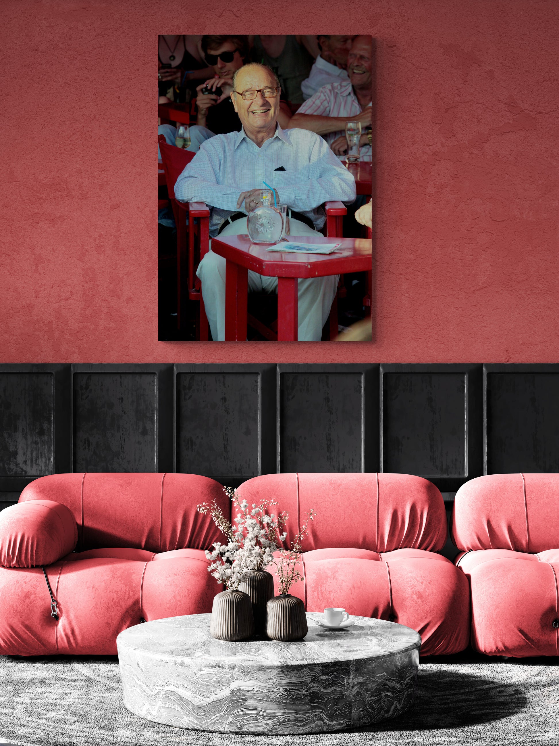 Découvrez le charme décontracté de Jacques Chirac sur la terrasse ensoleillée de Sénéquier à Saint-Tropez en 2010, La composition colorée et joyeuse de l'image crée une atmosphère chaleureuse et authentique, idéale pour une salle de séjour ou une salle à manger. Cette photo rend hommage à l'une des personnalités politiques les plus emblématiques de la France.