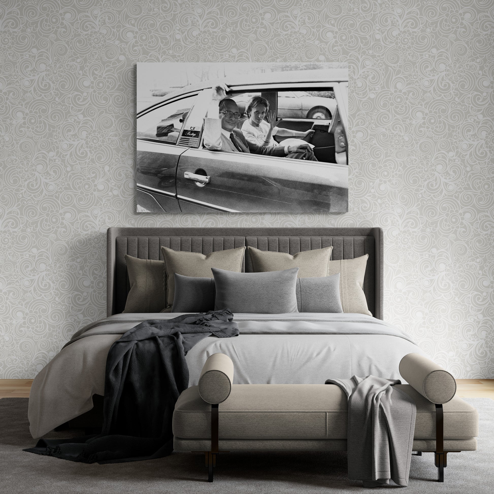 Jacques Chirac et de son épouse, Bernadette, en voiture à travers les rues emblématiques de la capitale française. Ajoutez une touche d'histoire et de charme parisien à votre espace avec cette photo.