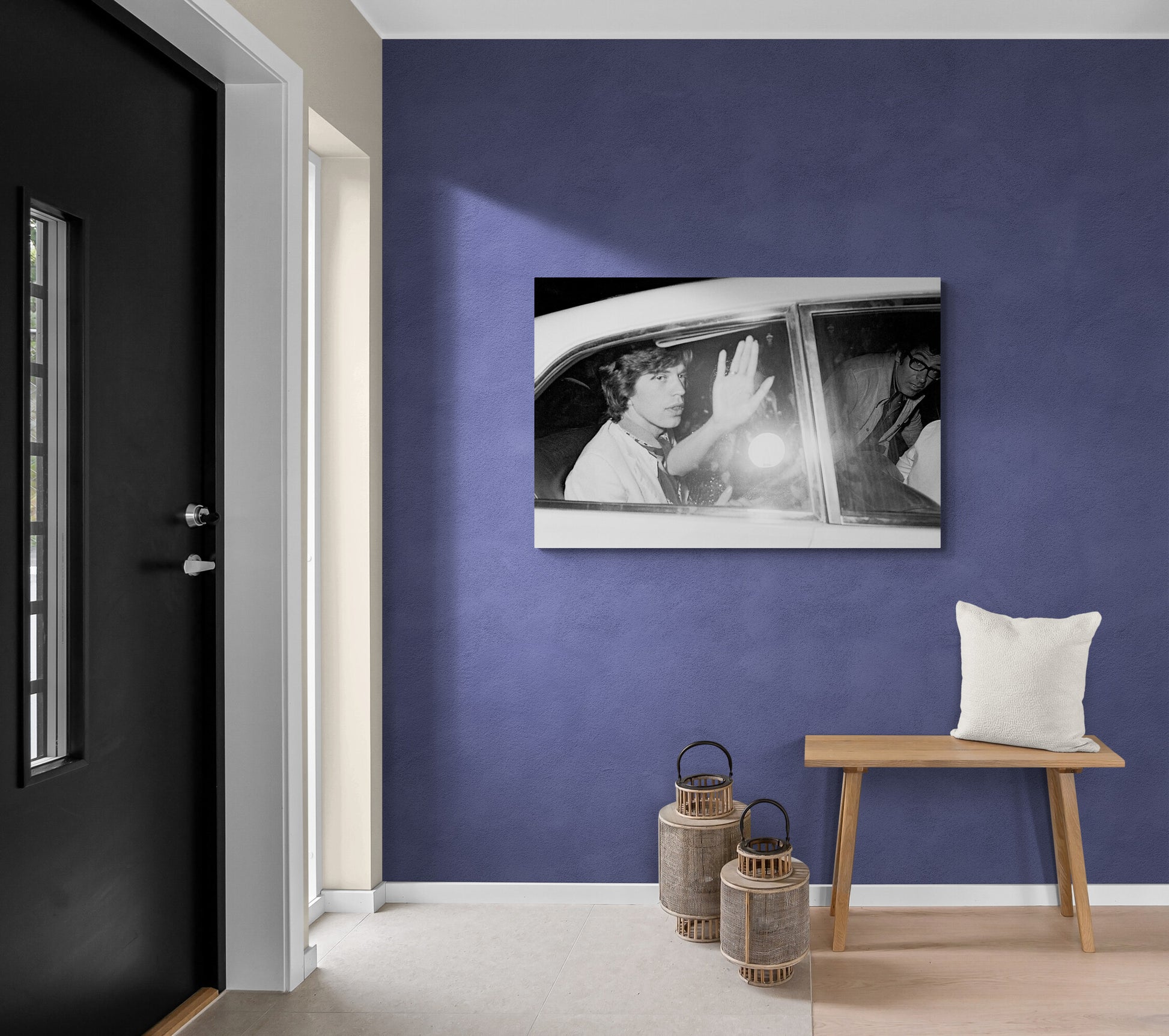 Mick Jagger et Bianca Moreno à travers la fenêtre d'une voiture, juste après leur cérémonie de mariage célébré à Saint-Tropez en 1971. On aperçoit aussi Roger Vadim dans l'encadrement de la portière. Cette photo prise par Daniel Angeli offre un aperçu de l'un des mariages les plus médiatisés de l'époque, un choix pour tout amateur de photographie d'art qui ajoutera une touche de glamour à votre décoration.