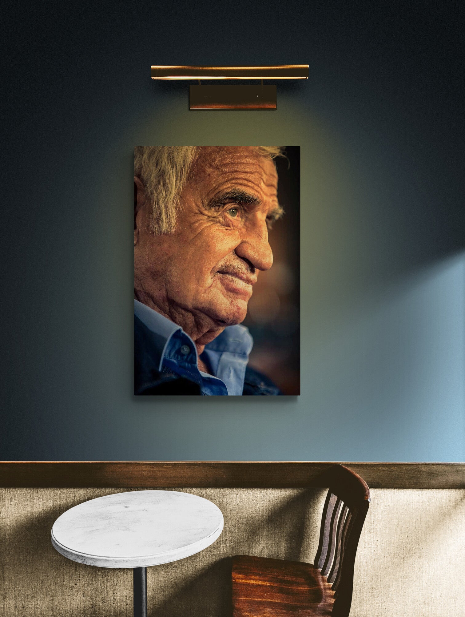 Cette photographie de Jean-Paul Belmondo, prise à Villerville, lieu emblématique du tournage de 'Un singe en hiver' pour le documentaire produit par son fils Paul en 2014. Elle capture l'intensité et la chaleur de l'un des acteurs les plus vénérés du cinéma français. Avec chaque ride racontant une histoire, son visage exprime une mosaïque d'émotions qui résonnent avec une carrière exceptionnelle.Cette image offre un portrait intime et émouvant du grand acteur Une œuvre d'art capturée pour les admirateurs de Belmondo et les amoureux du cinéma.