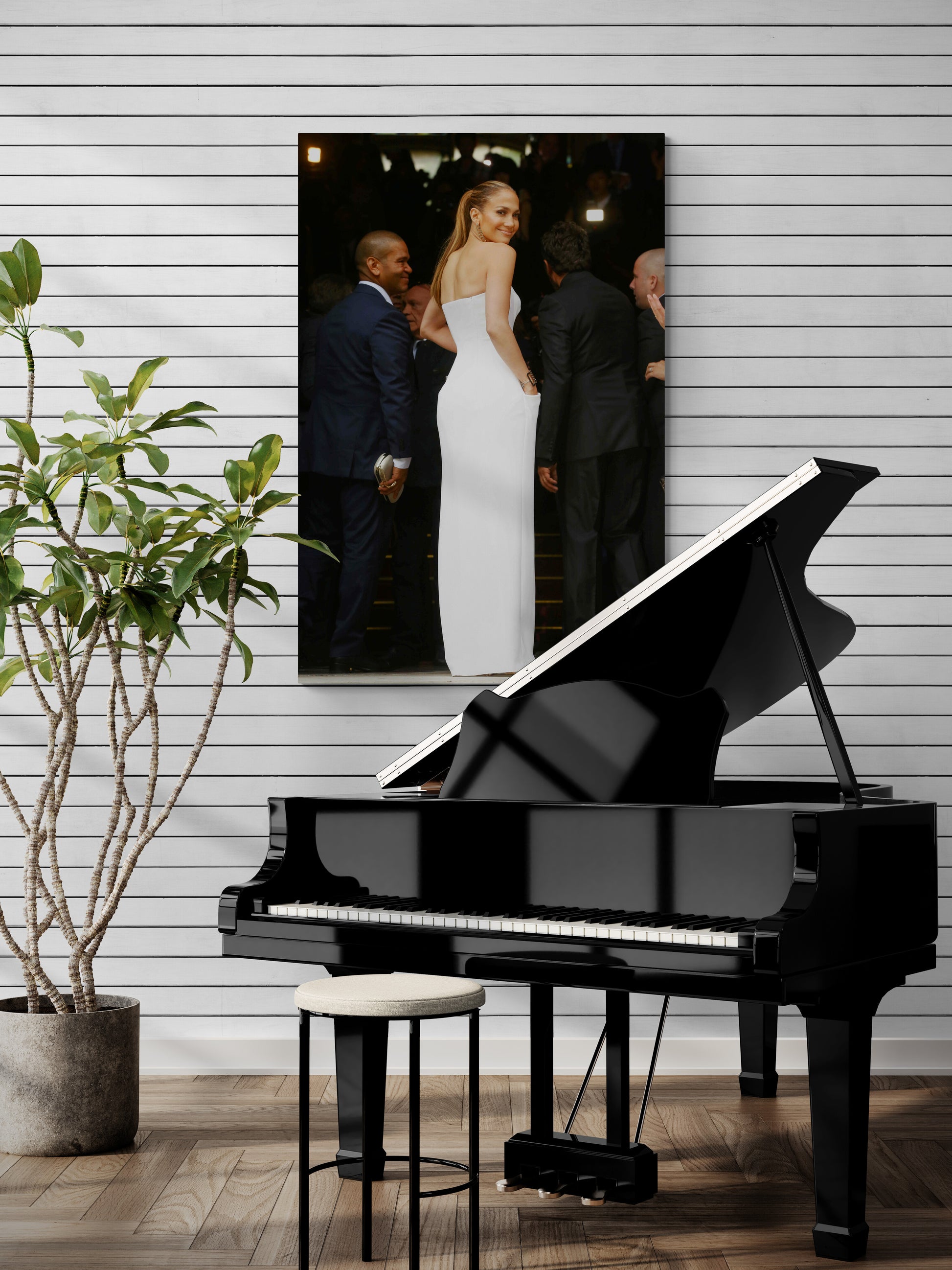 Coup d'oeil complice vers l'objectif, Jennifer Lopez fait une entrée remarquable au défilé Versace de la Fashion Week parisienne en 2014. Un moment où la mode rencontre le glamour, sous le signe de l'élégance.