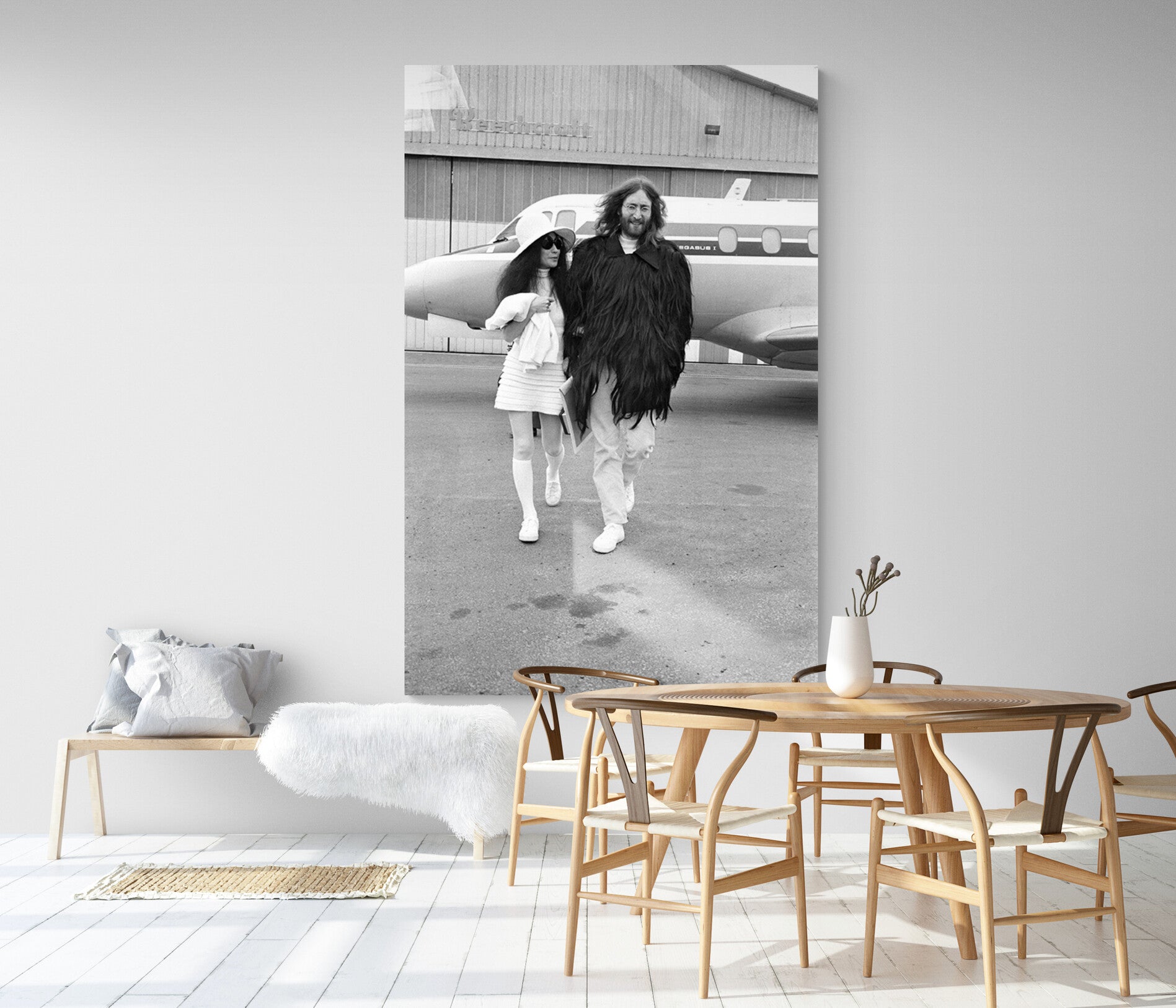 Cette photo emblématique, prise par Daniel Angeli à l'aéroport du Bourget, montre John Lennon et Yoko Ono juste avant leur envol pour aller se marier à Gibraltar. John Lennon propose alors à Daniel Angeli de monter avec eux dans l'avion pour photographier leur mariage. Daniel Angeli ne montera jamais dans l'avion, faute de passeport ! Cette anecdote ajoute une couche d'histoire personnelle à la photo, la rendant encore plus précieuse. John Lennon et Yoko Ono, un duo iconique et stylé pour sublimer vos murs.