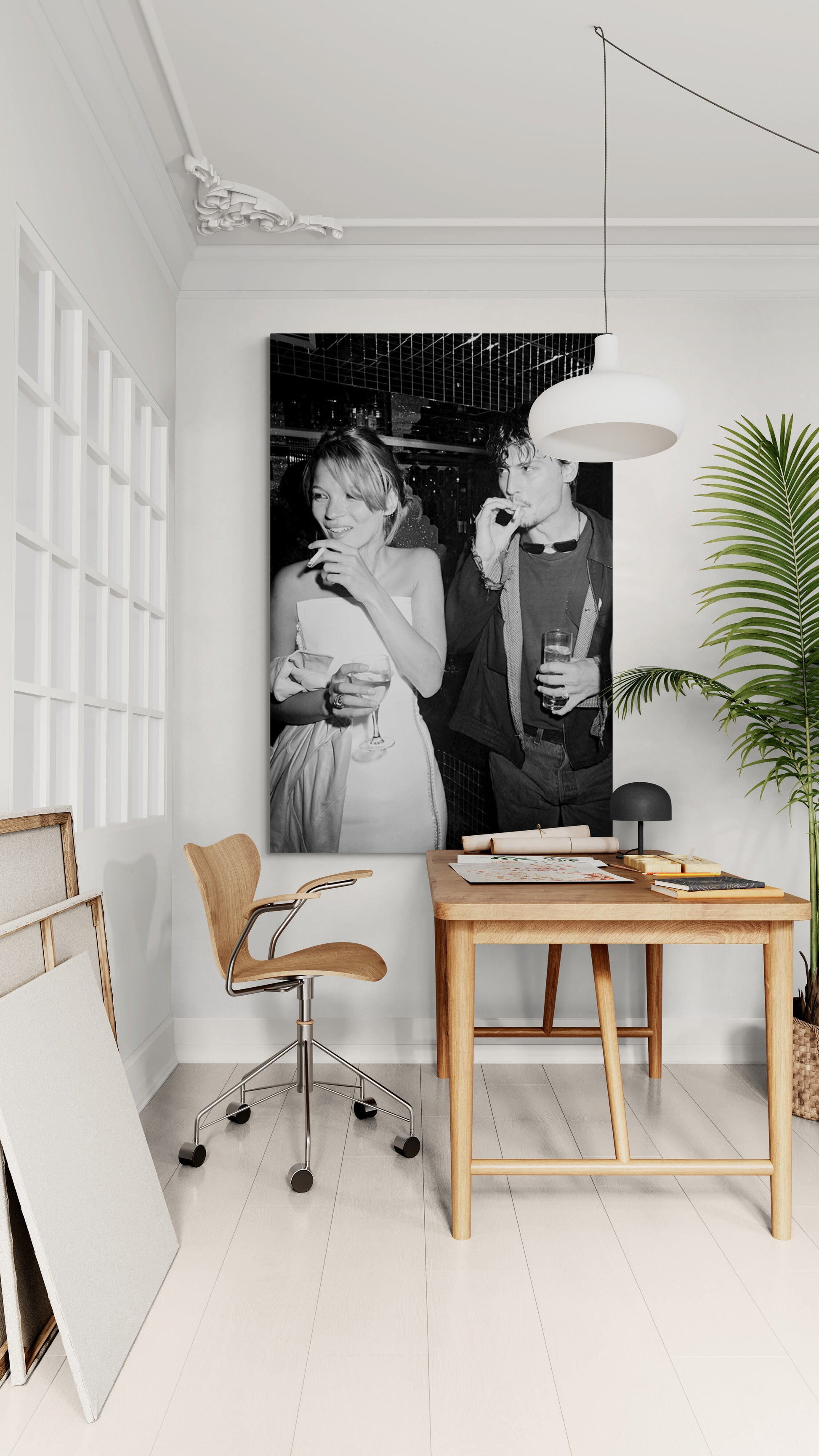 Johnny Depp et Kate Moss lors d'une soirée chez Versace à Paris en 1995. Ajoutez une touche de vintage chic à votre intérieur avec cette photographie.