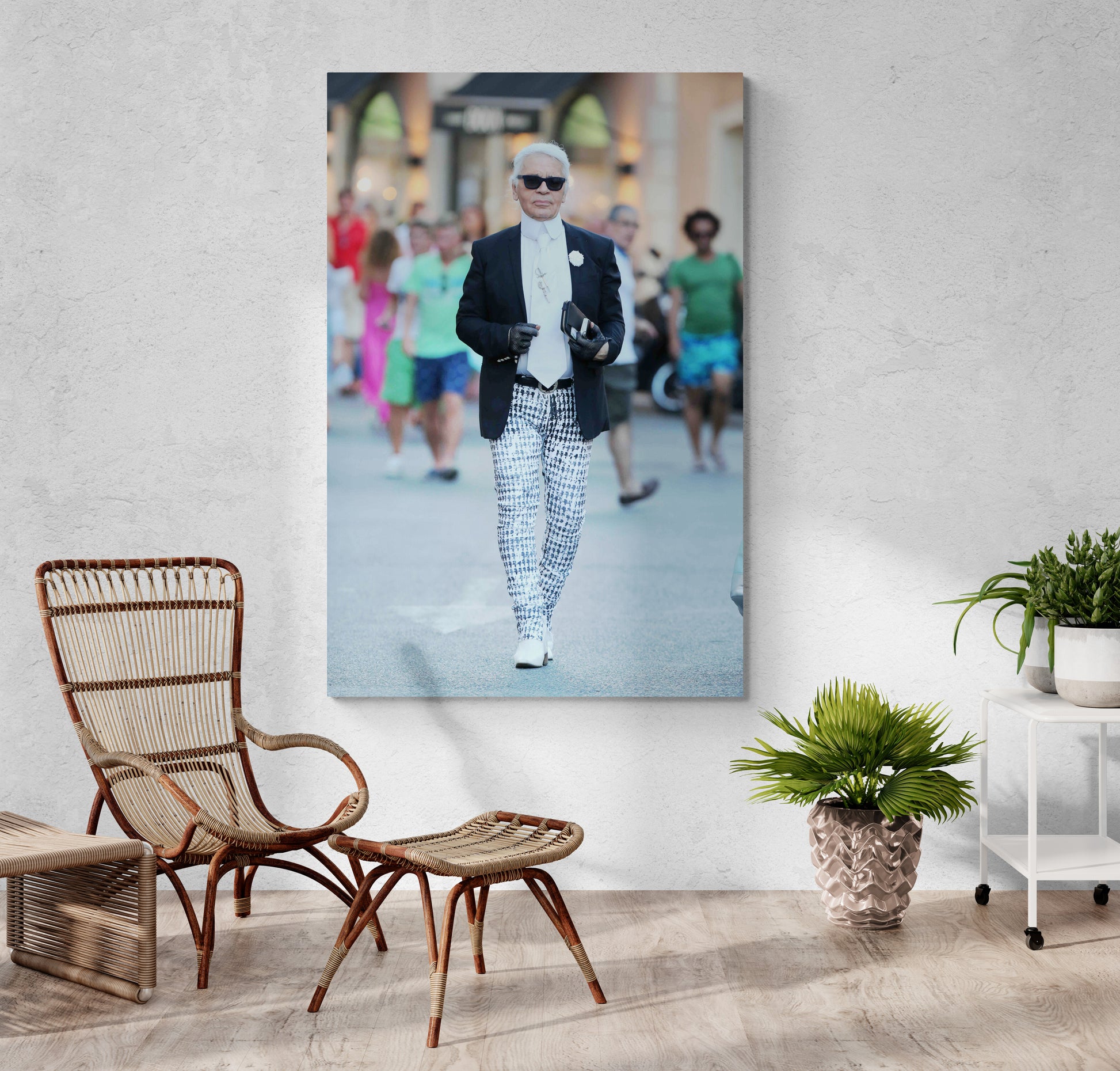 Karl Lagerfeld flâne dans les rues de Saint-Tropez. Son look sophistiqué et excentrique contrastant avec les tenues décontractées des badauds environnants. Cette photo clin d'œil , saura apporter une touche d'humour décalé et chic à votre intérieur.