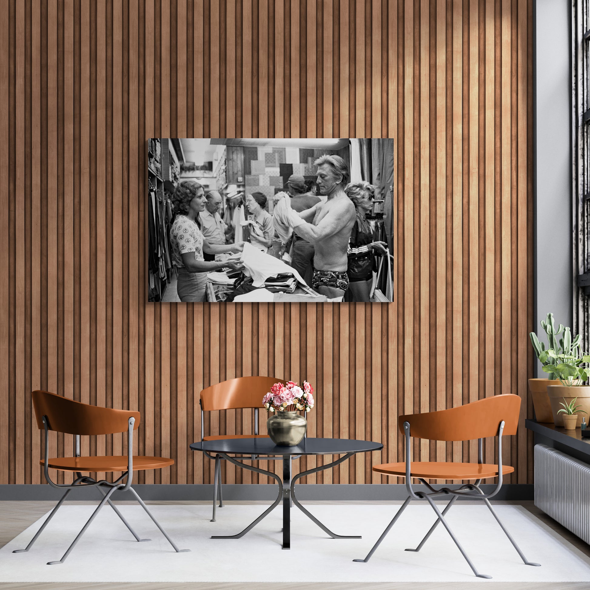 Cette photo prise en 1975 par Daniel Angeli, nous plonge dans une scène estivale atypique avec Kirk Douglas en plein essayage dans une petite boutique tropézienne. L'acteur n'hésite pas à se mettre torse nu devant la vendeuse et les clients. Cette image offre un aperçu rare et intime d'une icône d'Hollywood hors caméra, faisant d'elle un choix de décoration murale exceptionnel.