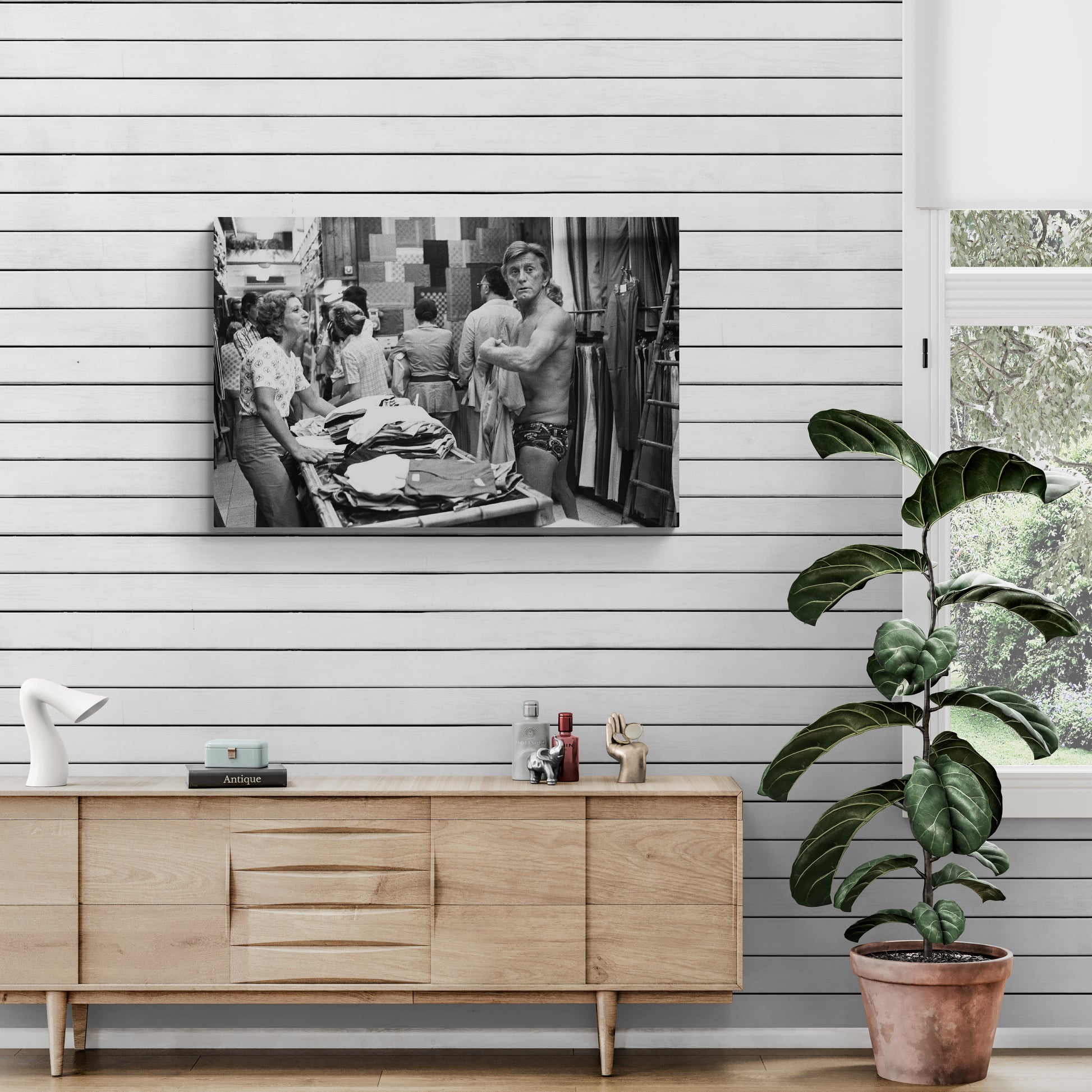 Cette photo prise en 1975 par Daniel Angeli, nous plonge dans une scène estivale atypique avec Kirk Douglas en plein essayage dans une petite boutique tropézienne. L'acteur légendaire incarne l'essence même de l'insouciance et du charme alors qu'il n'hésite pas à se mettre torse nu devant la vendeuse et les clients. Cette photographie est un ajout décoratif incomparable, idéal pour apporter un esprit vintage et une touche de glamour hollywoodien à tout intérieur.
