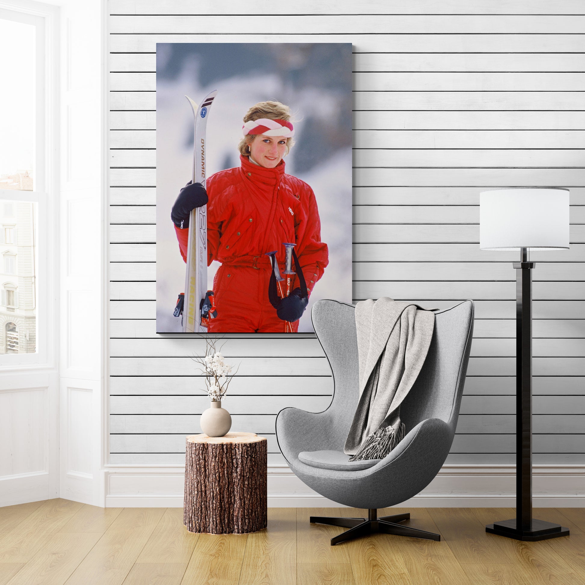 Cette photographie de Daniel Angeli montre Diana, la princesse de Galles, à Klosters en Suisse en 1986. Klosters était une destination de ski prisée pour Diana et Charles, en faisant donc un lieu incontournable pour les photographes du monde entier. Le couple royal se conformait à ses obligations de relations publiques en posant pour les photos à leur arrivée à la station, et cette image illustre bien cette dynamique, reflétant à la fois la grâce de Diana et le sens de la mode de l'époque qui lui a valu tant d'admiration.