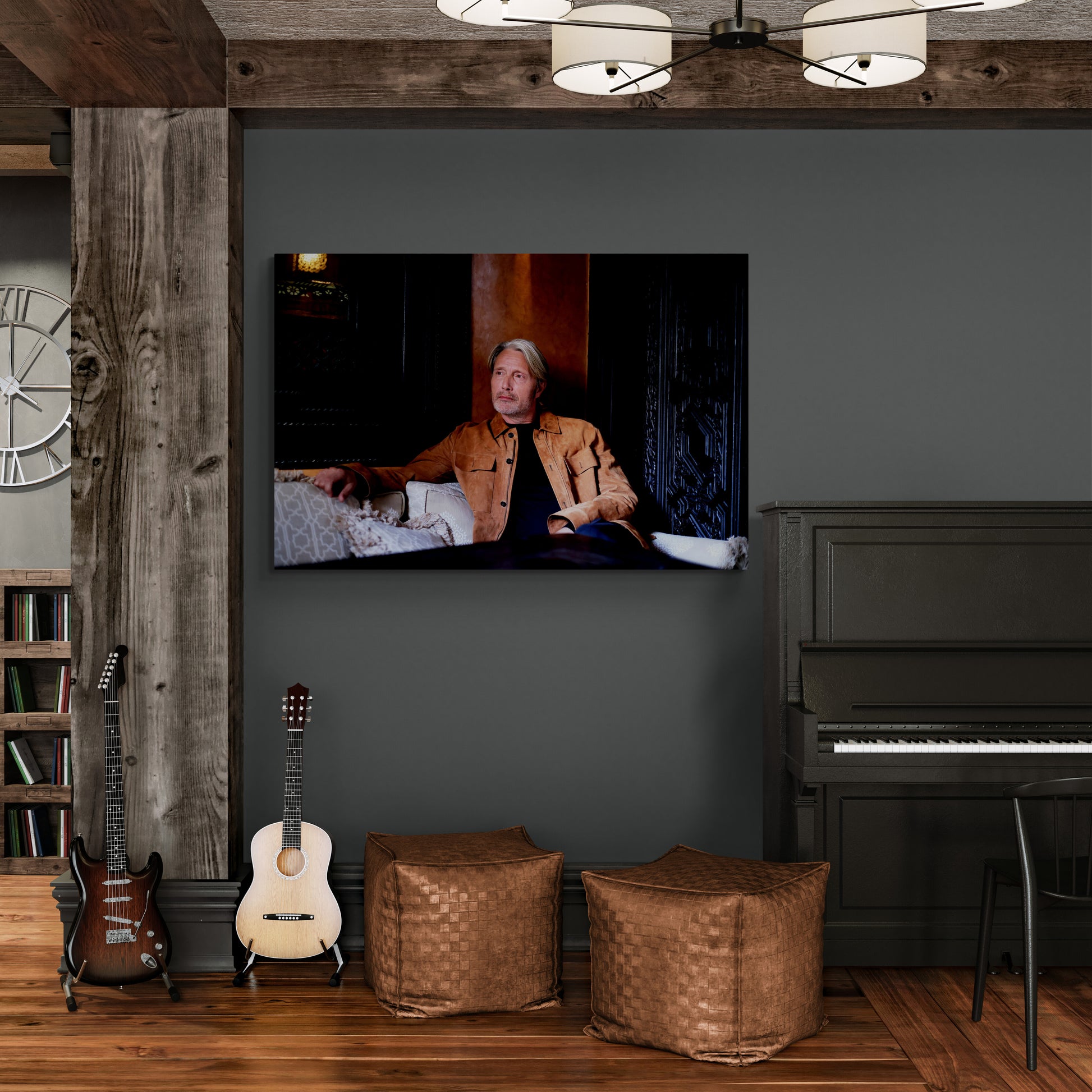 Mads Mikkelsen dans l'ambiance luxueuse de la Mamounia à Marrakech, lors du 20ème Festival International du Film en novembre 2023. Cette photo apporte à n'importe quel décor une ambiance chaleureuse et douce.