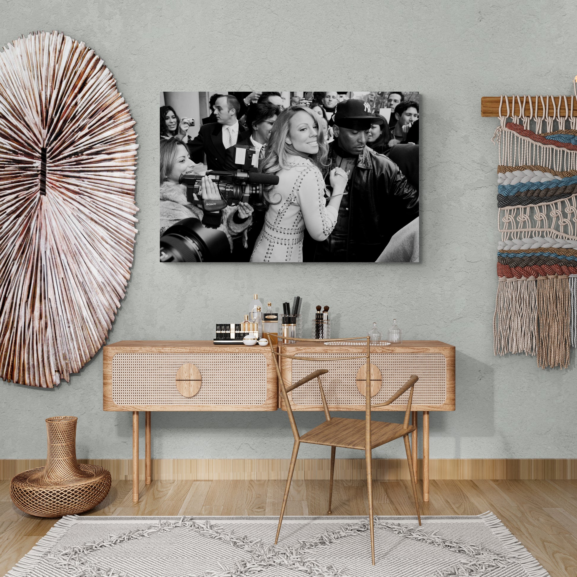 Mariah Carey lors du tournage de son clip vidéo "Say Somethin'" dans les rues de Paris, avec l'icône musicale Pharrell Williams. Leur complicité et l'énergie du moment sont palpables alors qu'ils sont entourés par l'excitation des fans et des médias. Cette image est une célébration de la musique, du style et de la culture pop, un choix glamour pour un espace contemporain.