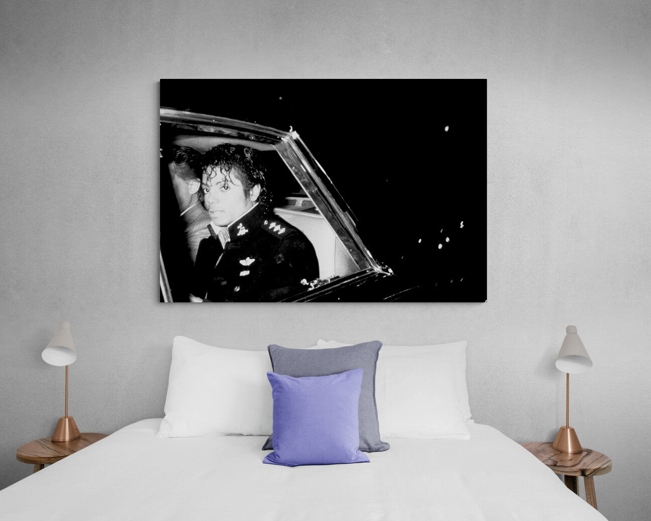 Michael Jackson est photographié à Londres en 1985. L'image offre un contraste dramatique entre la célébrité et la solitude, capturant une facette rarement vue du légendaire artiste. La rareté de l'instant et le look immédiatement identifiable de Michael Jackson enrichissent la dimension décorative de la photographie.