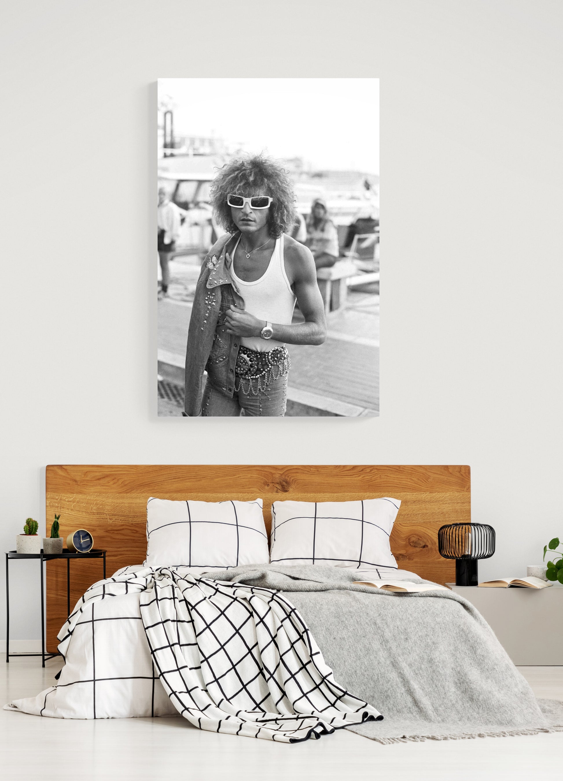 Daniel Angeli signe ce portrait de Michel Polnareff, sur le port de Saint-Tropez en 1972. Parfait pour une décoration qui aspire à capturer l'âme de l'époque grâce au look immédiatement indentifiable de l'artiste.