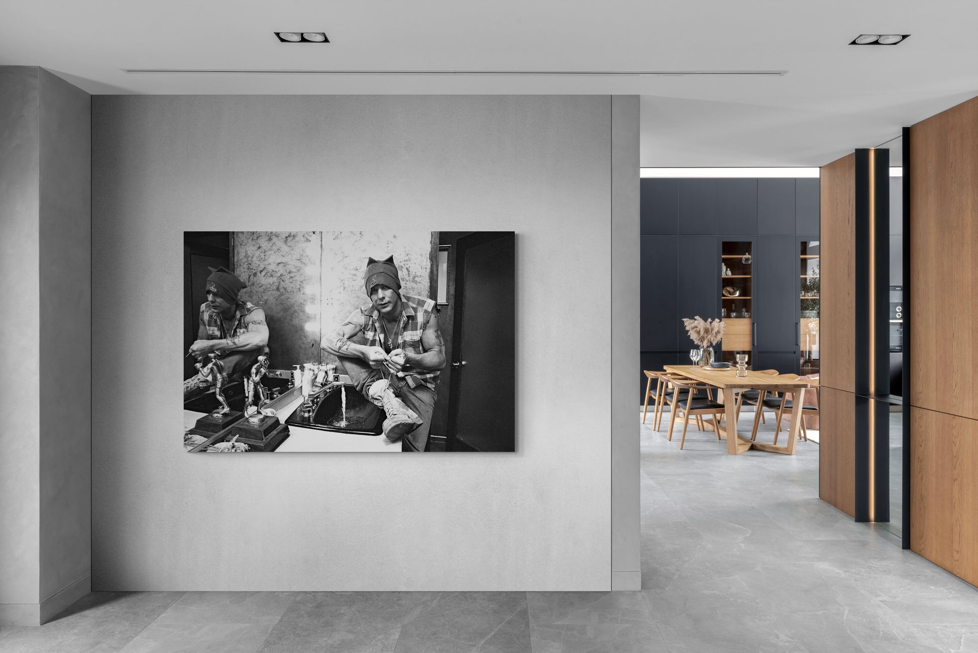 Dans cette photographie en noir et blanc, Mickey Rourke se reflète dans le miroir d'une loge à Los Angeles en 1993. Un instantané intime et puissant, qui apportera une touche rebelle à votre intérieur.