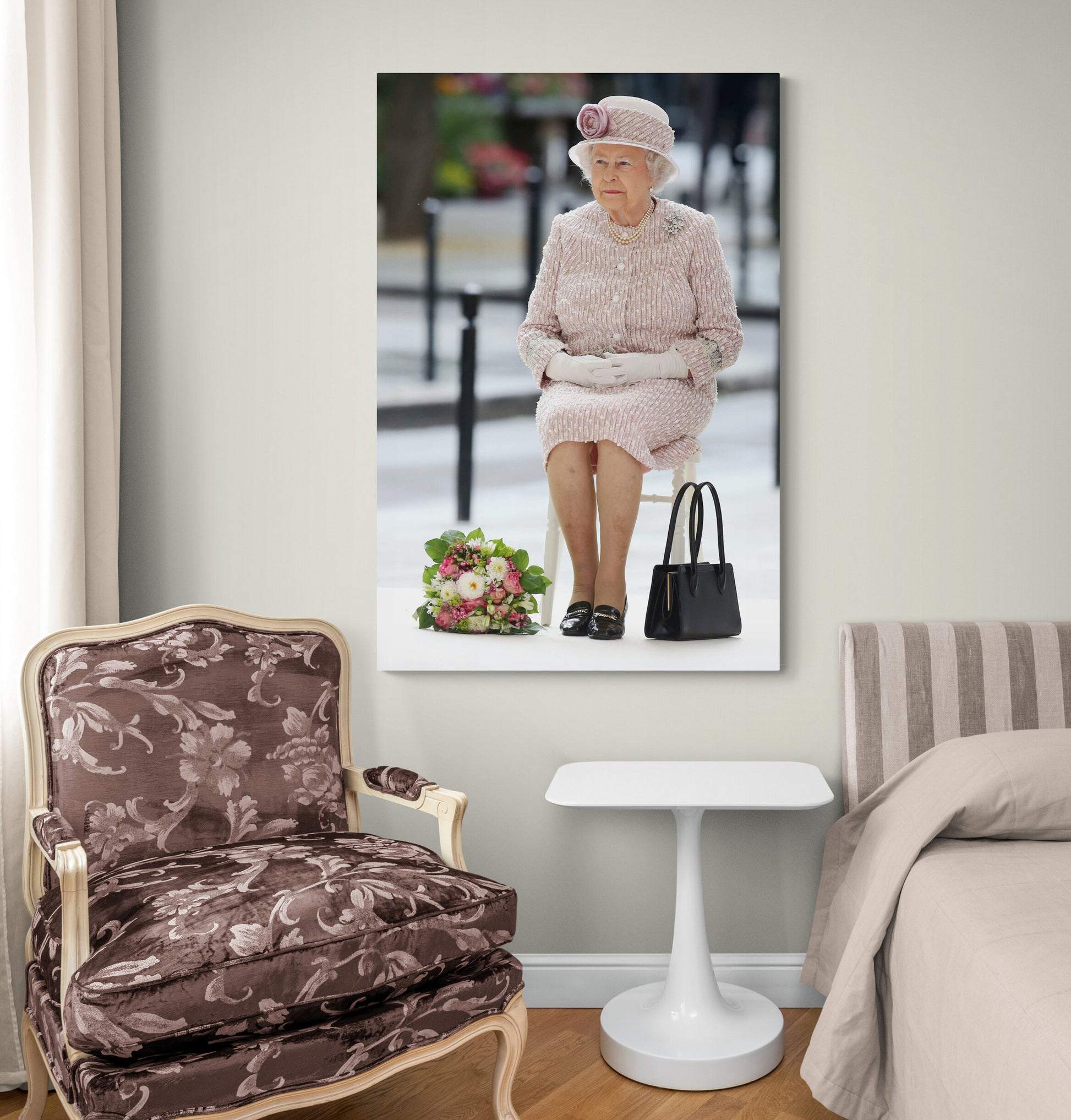 La Reine Elisabeth II d'Angleterre explore le Marché aux Fleurs de Paris lors de sa visite en juin 2014. Cette photographie touchante et insolite, pleine de charme et d'histoire, apporte une touche royale et intemporelle à tout intérieur.