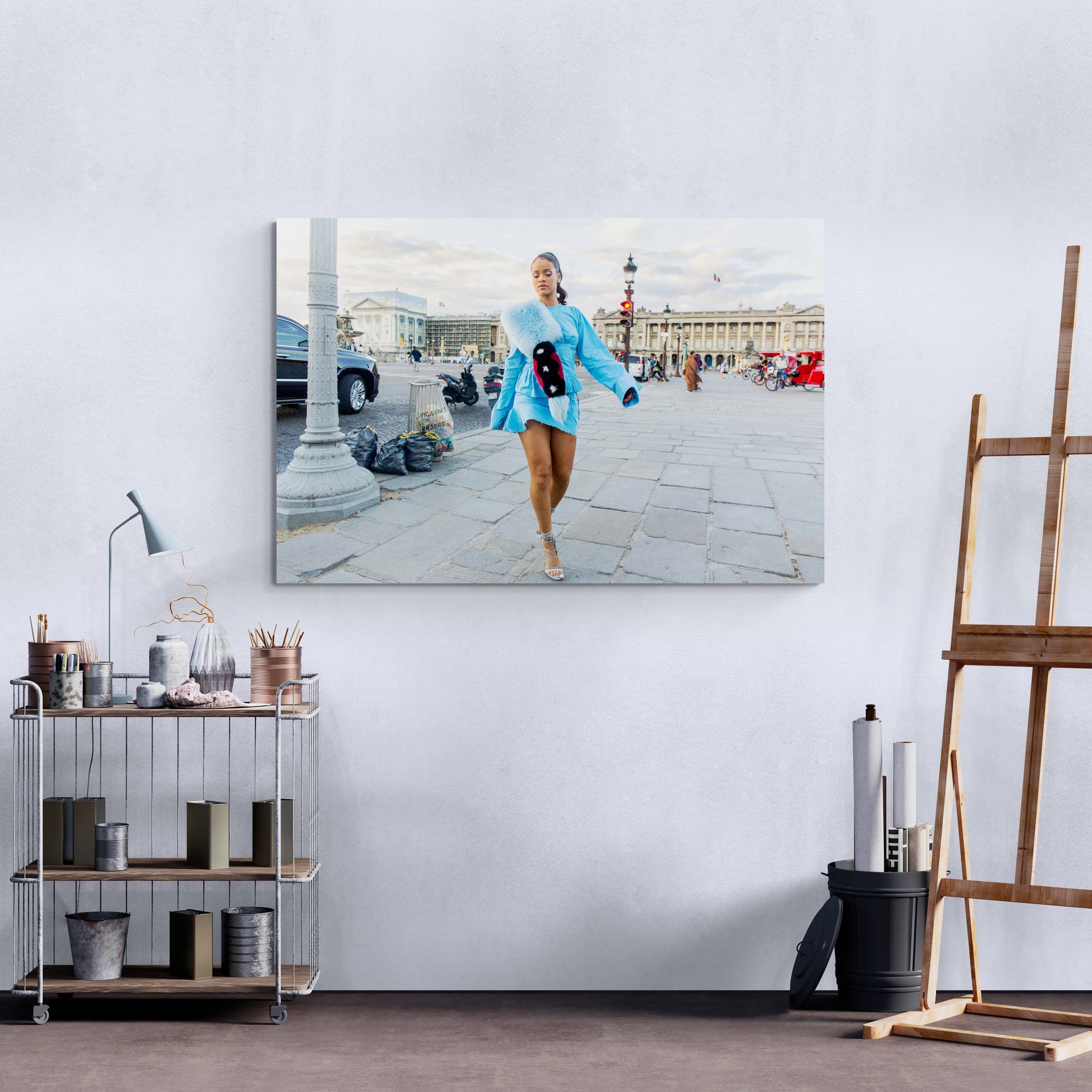Cette photo de Rihanna, prise place de la Concorde à Paris en 2016, montre un contraste surprenant entre la tenue stylée de la chanteuse et les poubelles sur le trottoir à côté d'elle. Cette juxtaposition crée une scène insolite, mélangeant glamour et réalité urbaine. En tant qu'élément décoratif, cette image ajoute une touche d'humour à un intérieur, mettant en lumière la dualité du monde des célébrités.