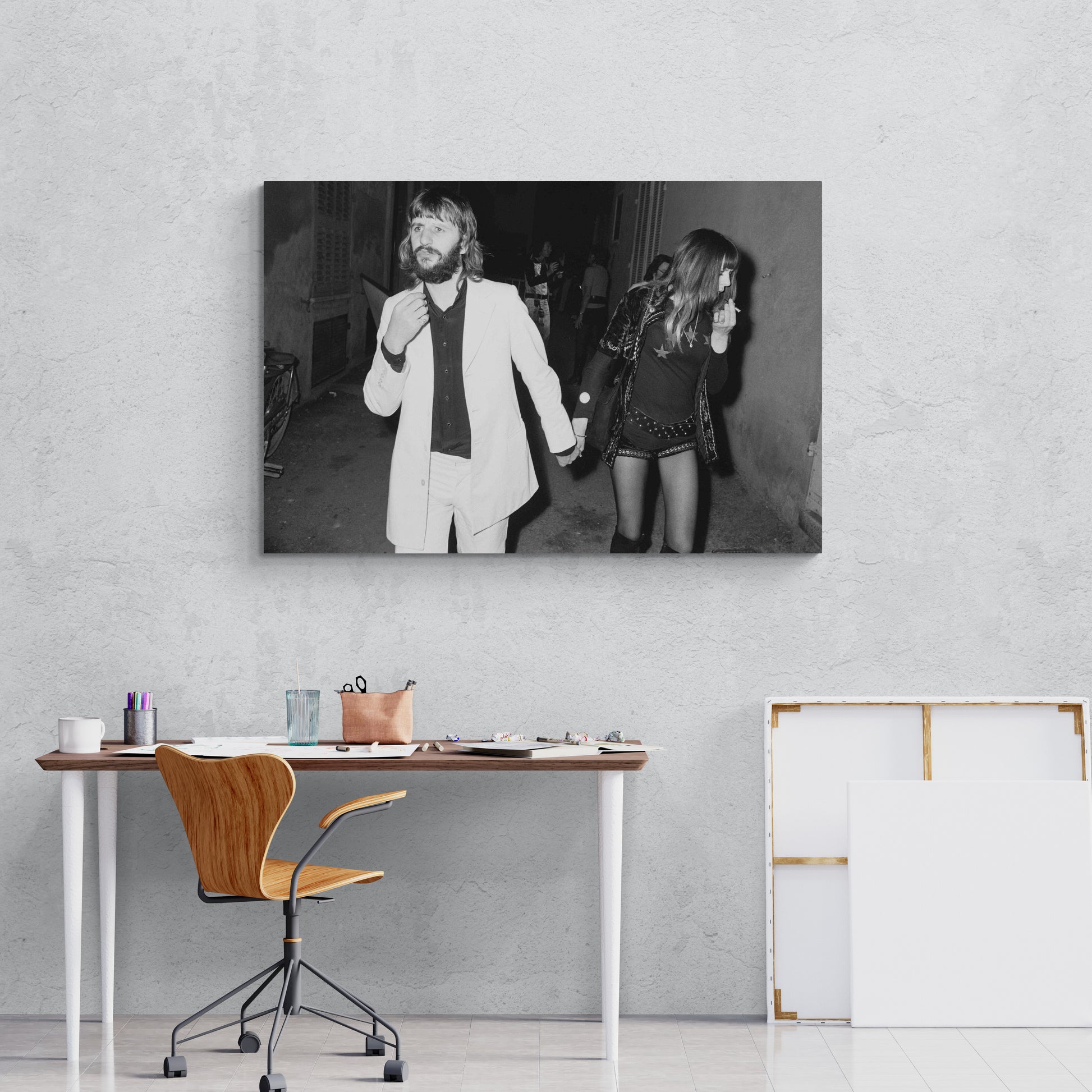 Capturez l'essence du glamour des années 70 avec cette photographie prise par Daniel Angeli. Ringo Starr, le légendaire batteur des Beatles, et sa femme Maureen incarnent l'élégance et le style lors du mariage de Mick Jagger et Bianca Moreno à Saint-Tropez en 1971. Imprégnez votre espace de vie d'une touche de l'histoire du rock 'n' roll avec cette pièce emblématique, parfaite pour ajouter une sophistication vintage à votre décoration intérieure.