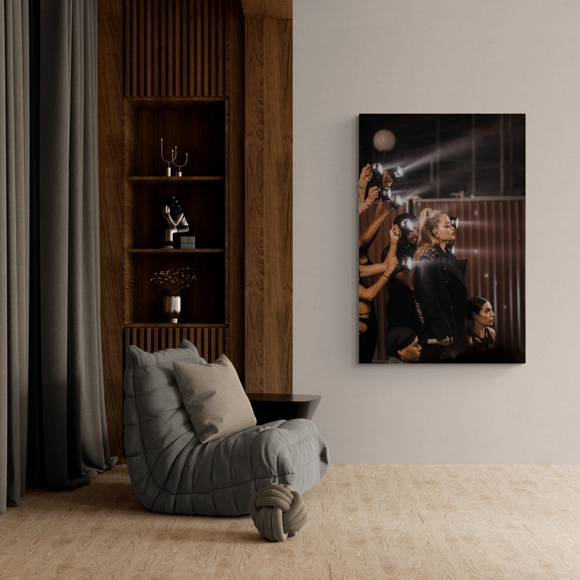 Plongez dans l'atmosphère électrique de Paris avec cette capture unique de Rita Ora captivant le public lors de son spectacle "Rita Ora live from The Eiffel Tower". Les faisceaux lumineux donnent une ambiance particulière à cette photo en faisant un élément de décoration moderne et stylé.