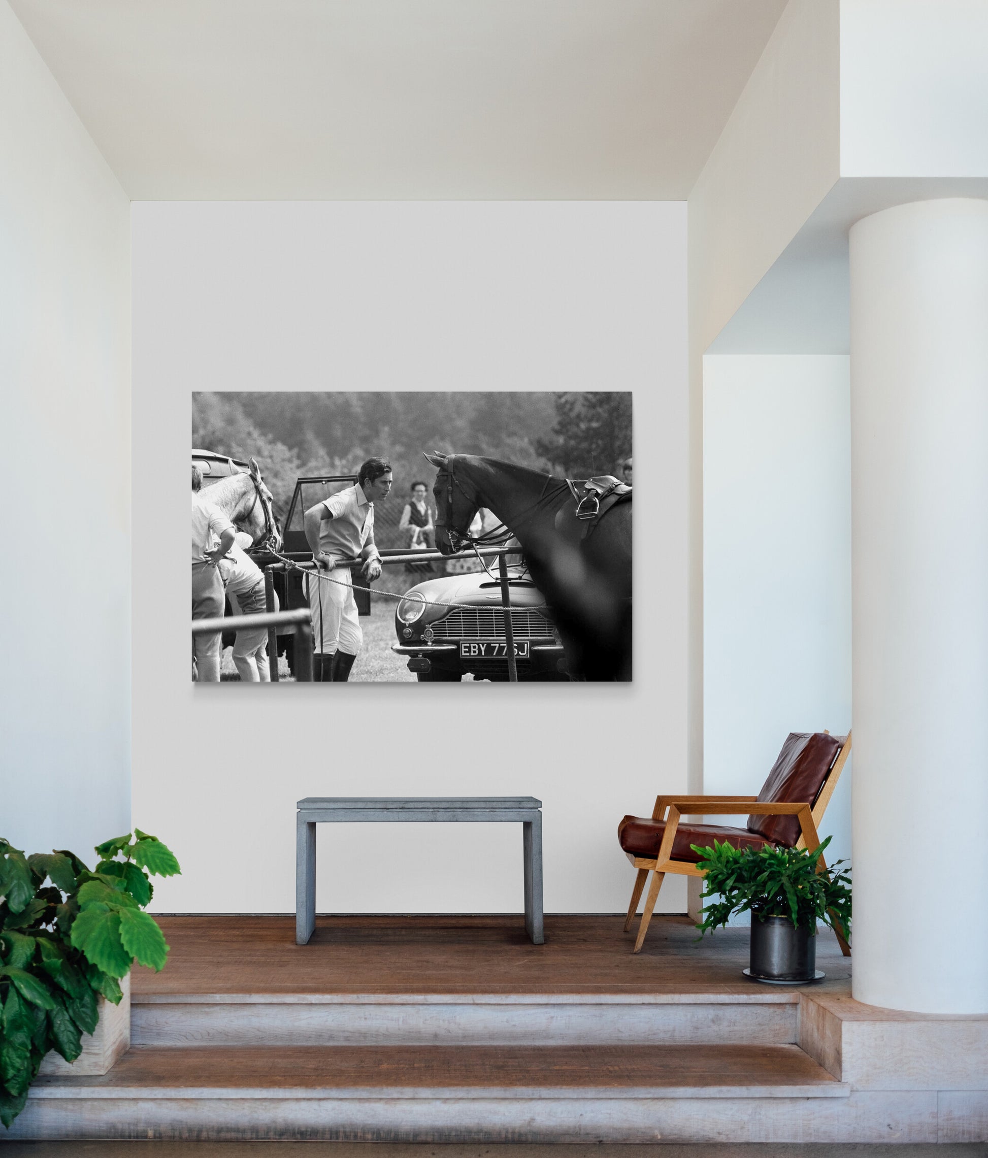 Le Prince Charles, futur Roi Charles III à Badminton, en Angleterre, en 1979 par Daniel Angeli. Le futur monarque, en tenue de polo, paraît engagé dans un dialogue silencieux avec son cheval, illustrant la complicité et la confiance partagées entre un cavalier et son cheval. Cette photographie, conversation entre le sang bleu et le sang chaud, offre une touche vintage, royale, et indéniablement une touche humouristique à votre décoration.
