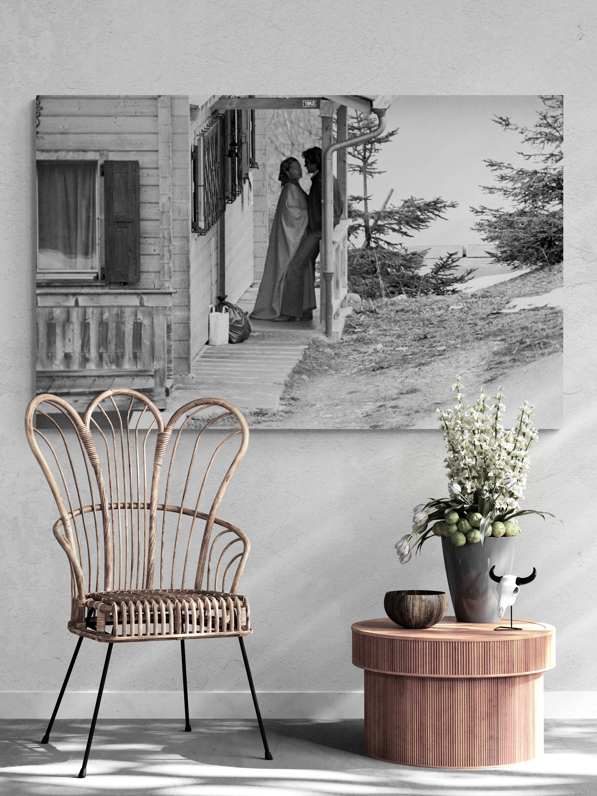 En 1976, le photographe Daniel Angeli capture un moment privé entre Romy Schneider et Daniel Biasini, au seuil de leur chalet en Suisse. Le couple, absorbé dans un baiser, semble inconscient de l'objectif qui saisit leur intimité. Derrière eux, le chalet et le paysage des Diablerets forment un arrière-plan à la fois simple et spectaculaire, évoquant la tranquillité de la vie en montagne. Cette photo, dans sa simplicité, raconte une histoire de vie loin de la scène publique, offrant une touche de romantisme à n'importe quel espace de vie.