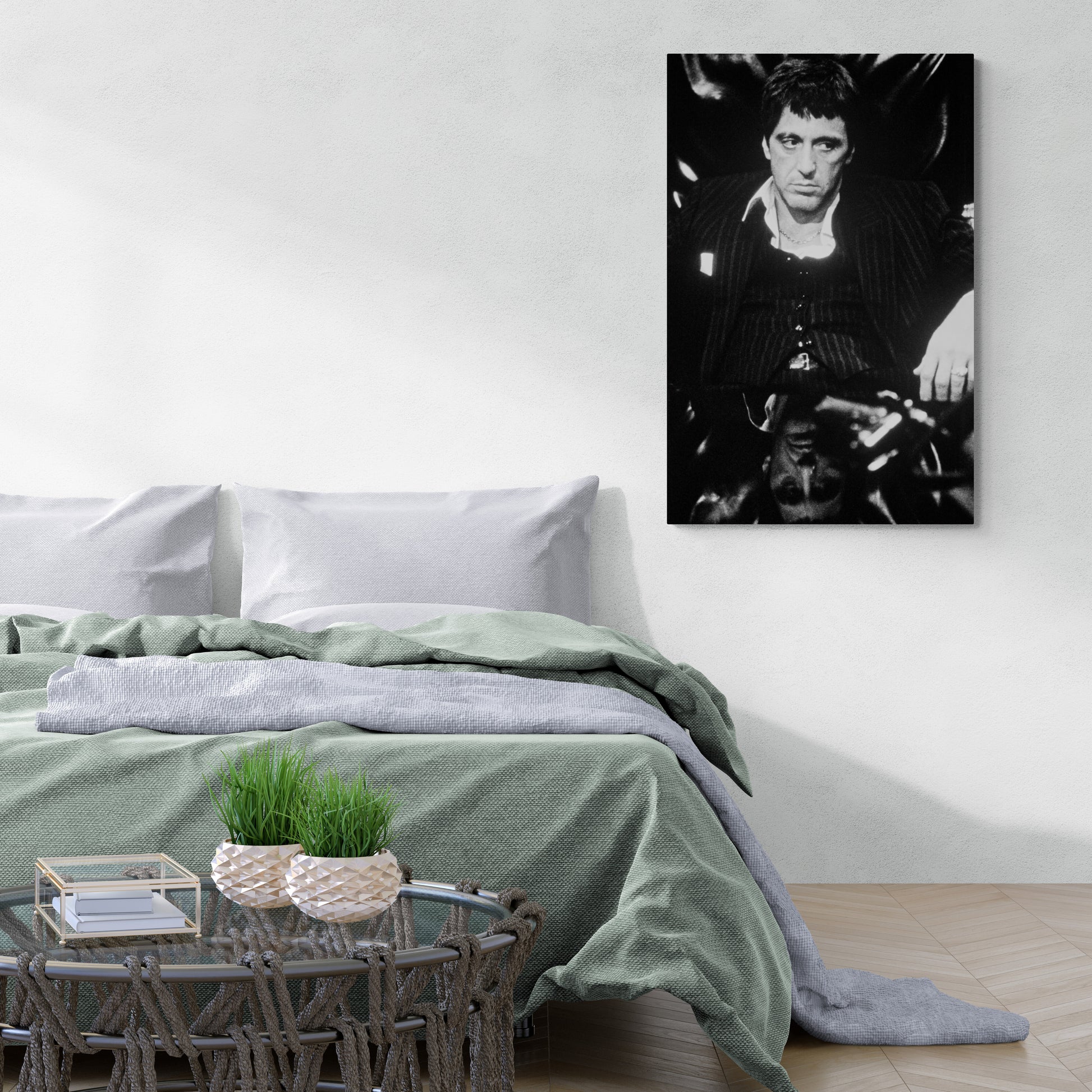 Cette photo de plateau saisit l'intensité d'Al Pacino sur le tournage de "Scarface" en 1983, incarnant parfaitement l'esprit de son personnage emblématique, idéale pour les admirateurs de ce film culte et de cet acteur de légende qui souhaitent ajouter une touche d'authenticité cinématographique à leur décoration.