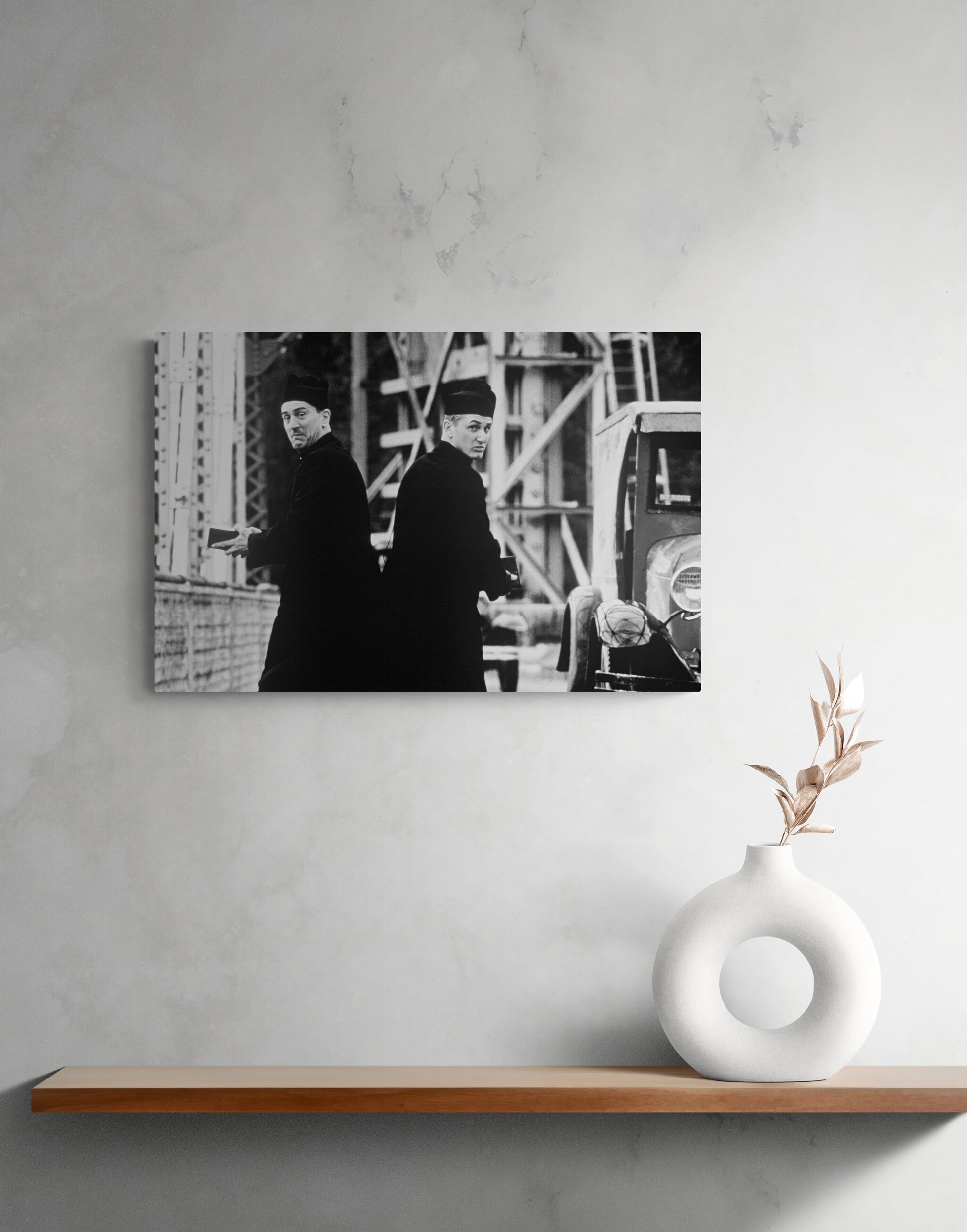 Sean Penn et Robert De Niro en plein tournage du film "We're No Angels" en 1989. Le contraste entre leurs expressions sérieuses et leurs costumes de curé offre une image insolite et décalée qui traduit l'esprit malicieux du film. Cette photo conviendrait parfaitement à un espace consacré au cinéma ou à un intérieur moderne cherchant à incorporer un élément d'humour et de patrimoine cinématographique.