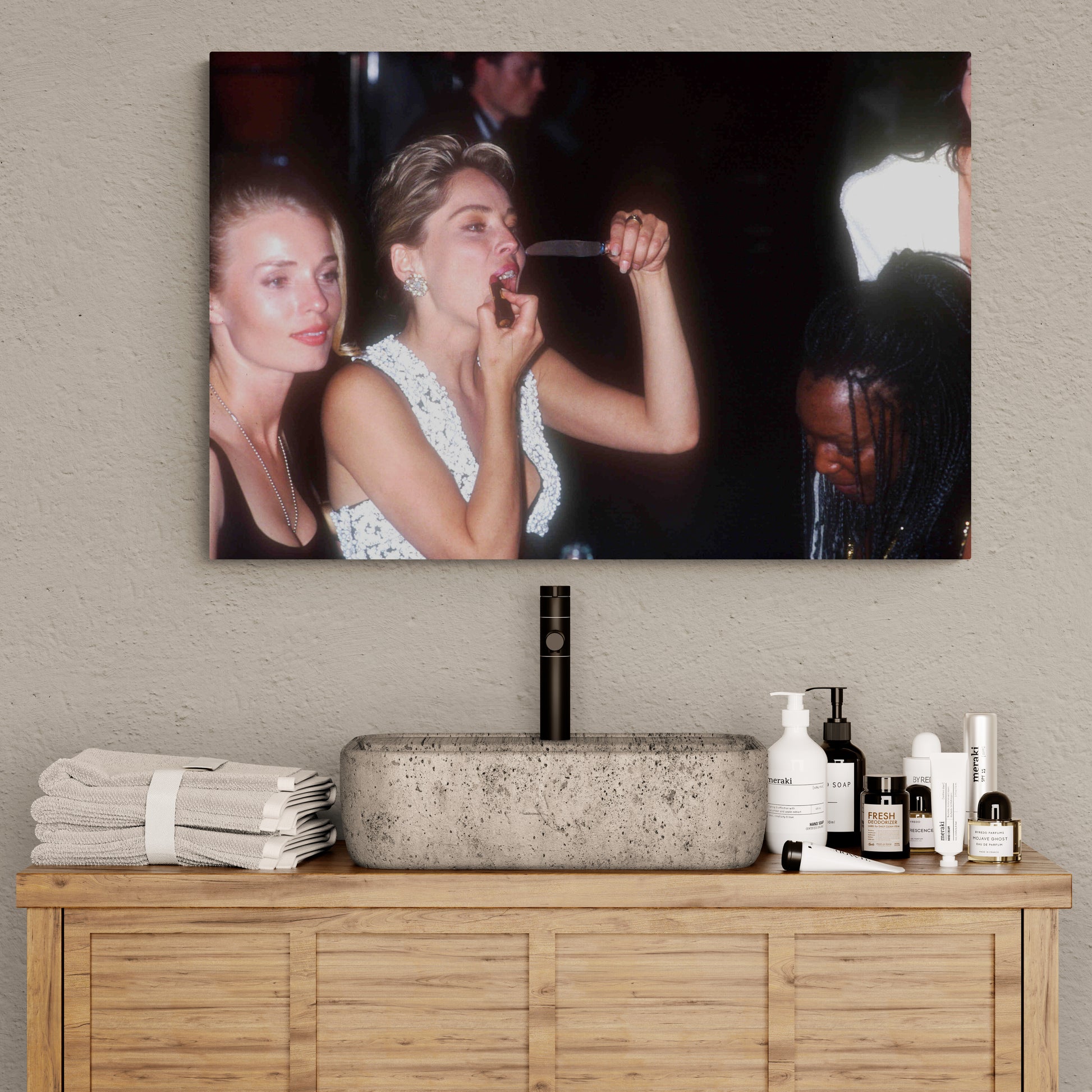 Sous l'œil attentif de Daniel Angeli, Sharon Stone, lors d'un dîner au Festival de Cannes en 1992, se sert de son couteau comme miroir pour appliquer son rouge à lèvres. Cette capture spontanée révèle le caractère imperturbable et l'esprit ingénieux de l'actrice, capable de transformer un geste ordinaire en un acte emblématique. Entourée par les convives et les flashes des photographes, elle incarne avec légèreté le glamour intemporel de ces moments cannois qui allient charme et beauté à une touche d'irrévérence.
