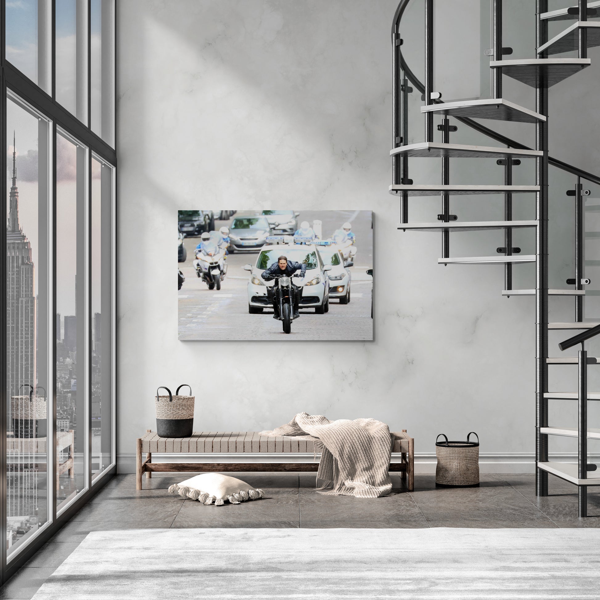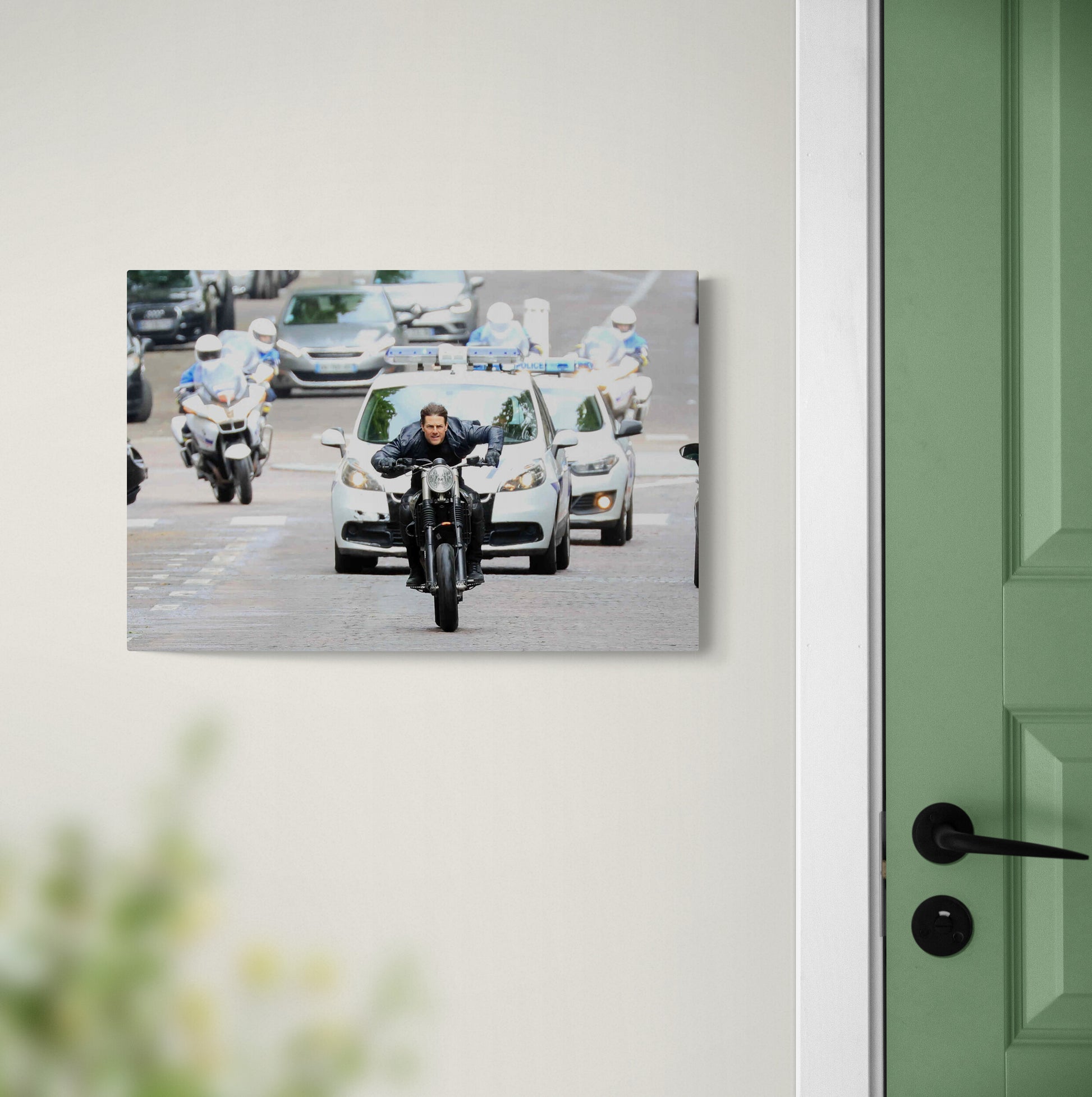 Tom Cruise incarne l'audace et l'adrénaline dans cette scène de course-poursuite à moto tournée dans les rues de Paris pour le film "Mission Impossible 6" en 2017. Cette photo apportera dynamisme, énergie et une touche holywoodienne à votre décor.