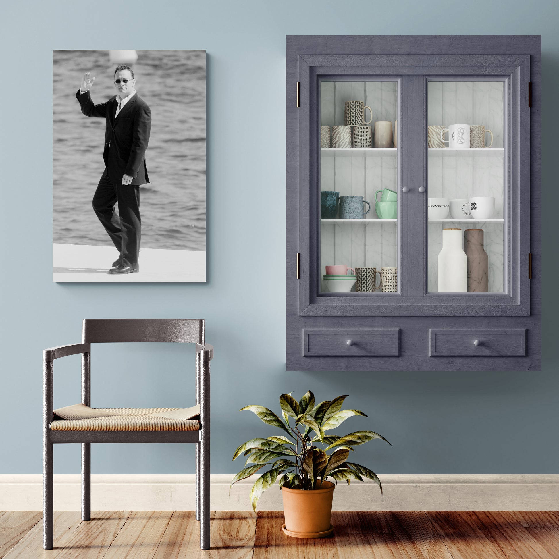 Tom Hanks salue les photographes à son arrivée sur le ponton de l'hôtel Eden Rock durant le Festival de Cannes en 2004.