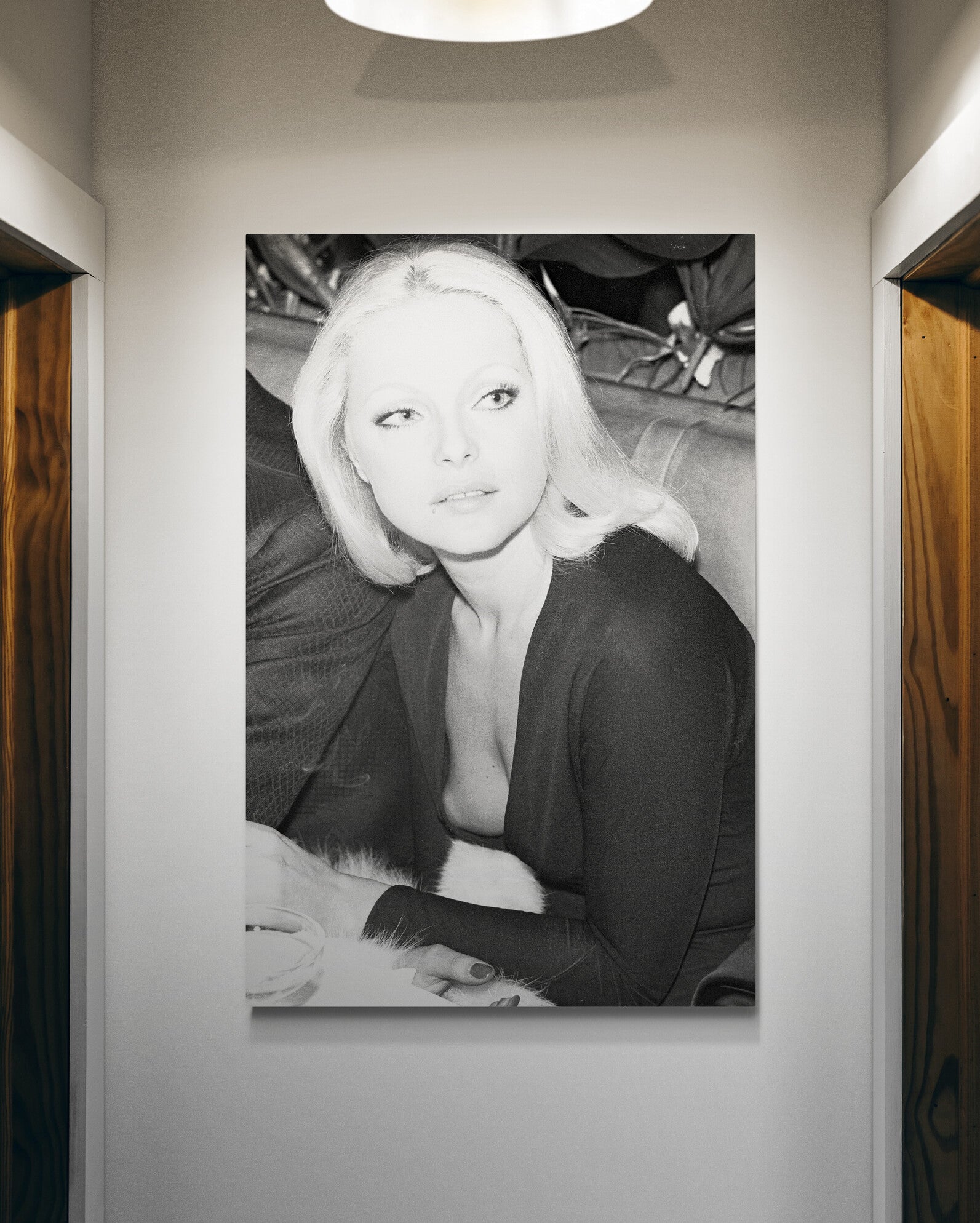 Virna Lisi, prise par Daniel Angeli lors de la première de "Les galets d'Etretat" à Paris en 1972. L'image offre une ambiance classique, faisant d'elle une décoration parfaite pour un espace qui cherche à incorporer le charme vintage et la sophistication des icônes du cinéma.